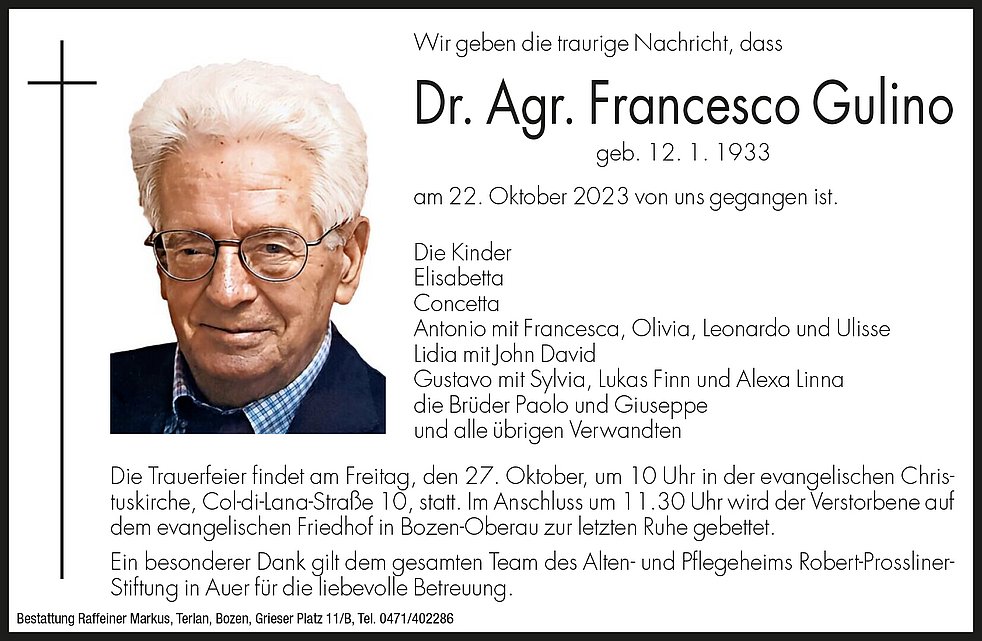 Die Trauerfeier findet am Freitag, den 27. Oktober, um 10 Uhr in der evangelischen Christuskirche, Col di Lana Str. 10 statt. Im Anschluss um 11.30 Uhr wird der Verstorbene auf dem evangelischen Friedhof in Bozen-Oberau zur letzten Ruhe gebettet.