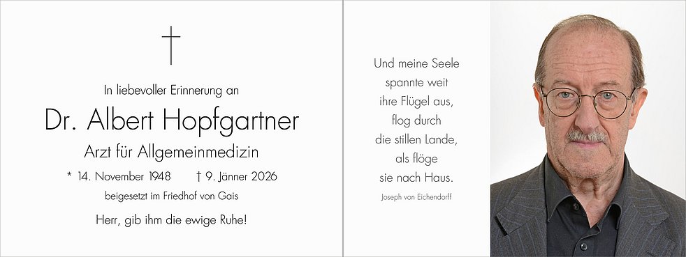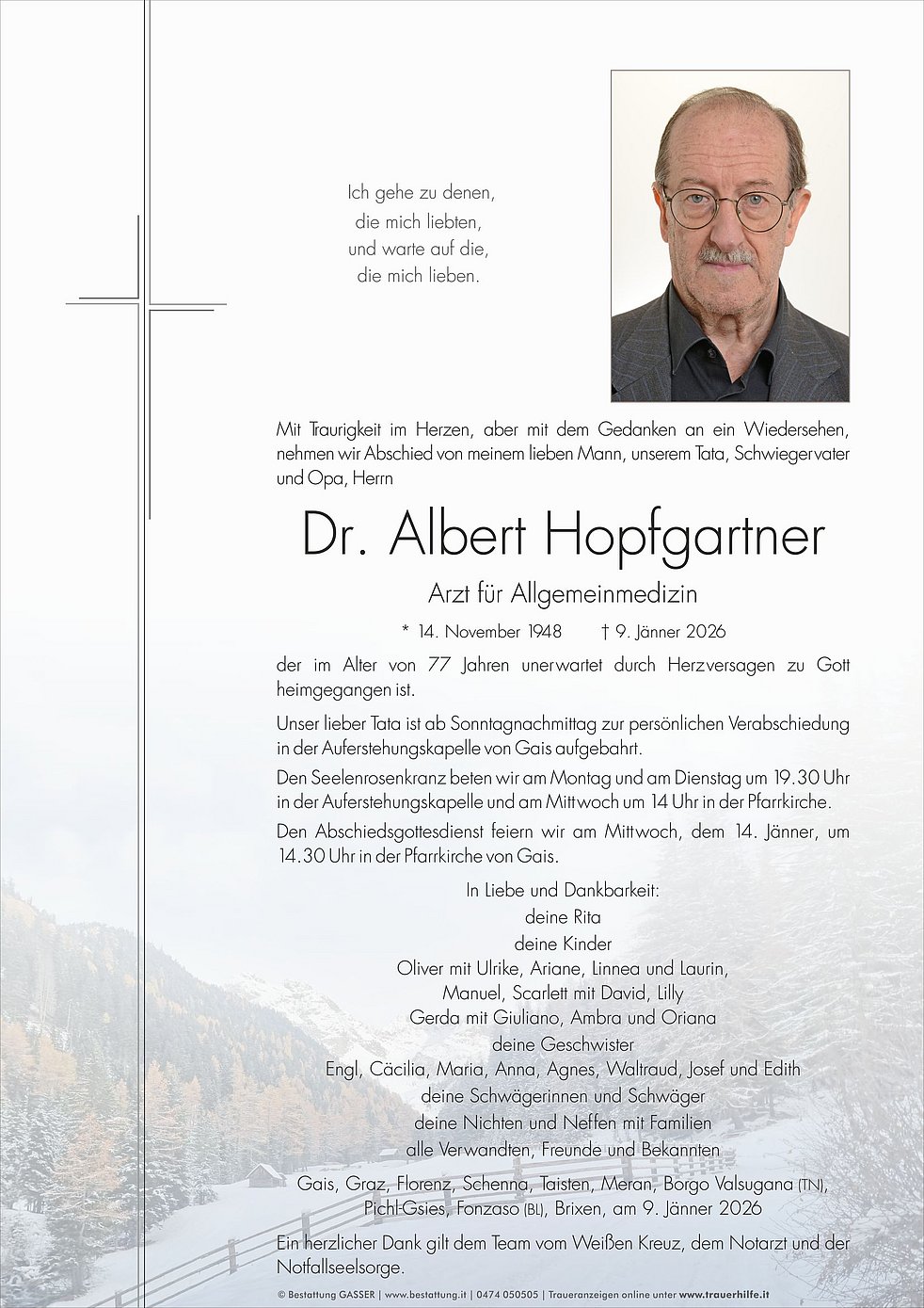 Den Abschiedsgottesdienst feiern wir am Mittwoch, dem 14. Jänner, um 14.30 Uhr in der Pfarrkirche von Gais.