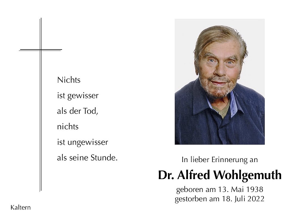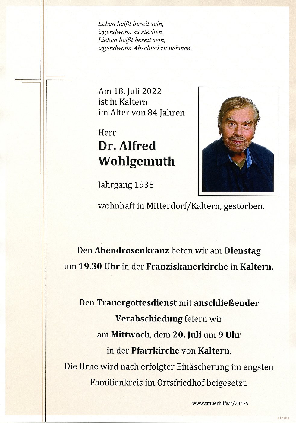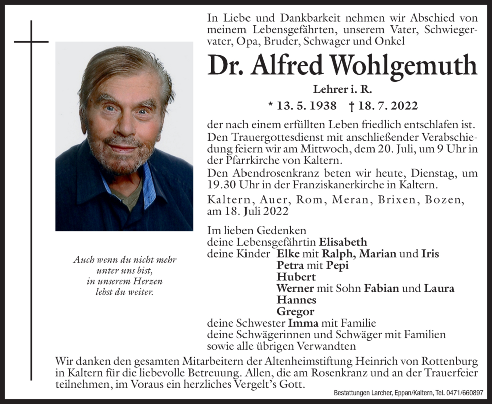 Den Trauergottesdienst mit anschließender Verabschiedung feiern wir am Mittwoch, 20. Juli um 9 Uhr in der Pfarrkirche von Kaltern.
