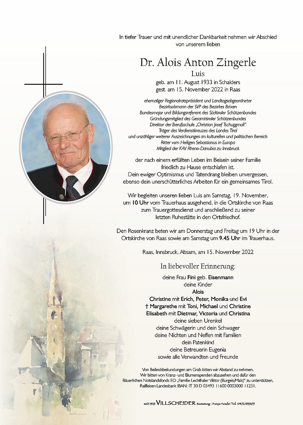 ich möchte euch auf diesem Wege mein aufrichtiges Beileid aussprechen. Dr. Zingerle war für mich ein großer, fairer Lehrer in der Berufsschule und später ein guter Freund im Schützenwesen. Ich werde Sie in lieber Erinnerung behalten.