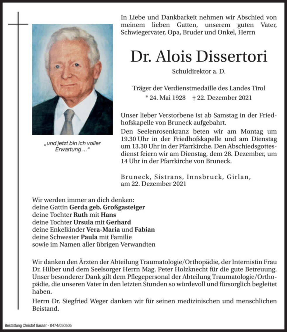 Wir danken den Ärzten der Abteilung Traumatologie/Orthopädie, der Internistin Frau Dr. Hilber und dem Seelsorger Herrn Mag. Peter Holzknecht für die gute Betreuung. Unser besonderer Dank gilt dem Pflegepersonal der Abteilung Traumatologie/Orthopädie, die unseren Vater in den letzten Stunden so würdevoll und fürsorglich begleitet haben.