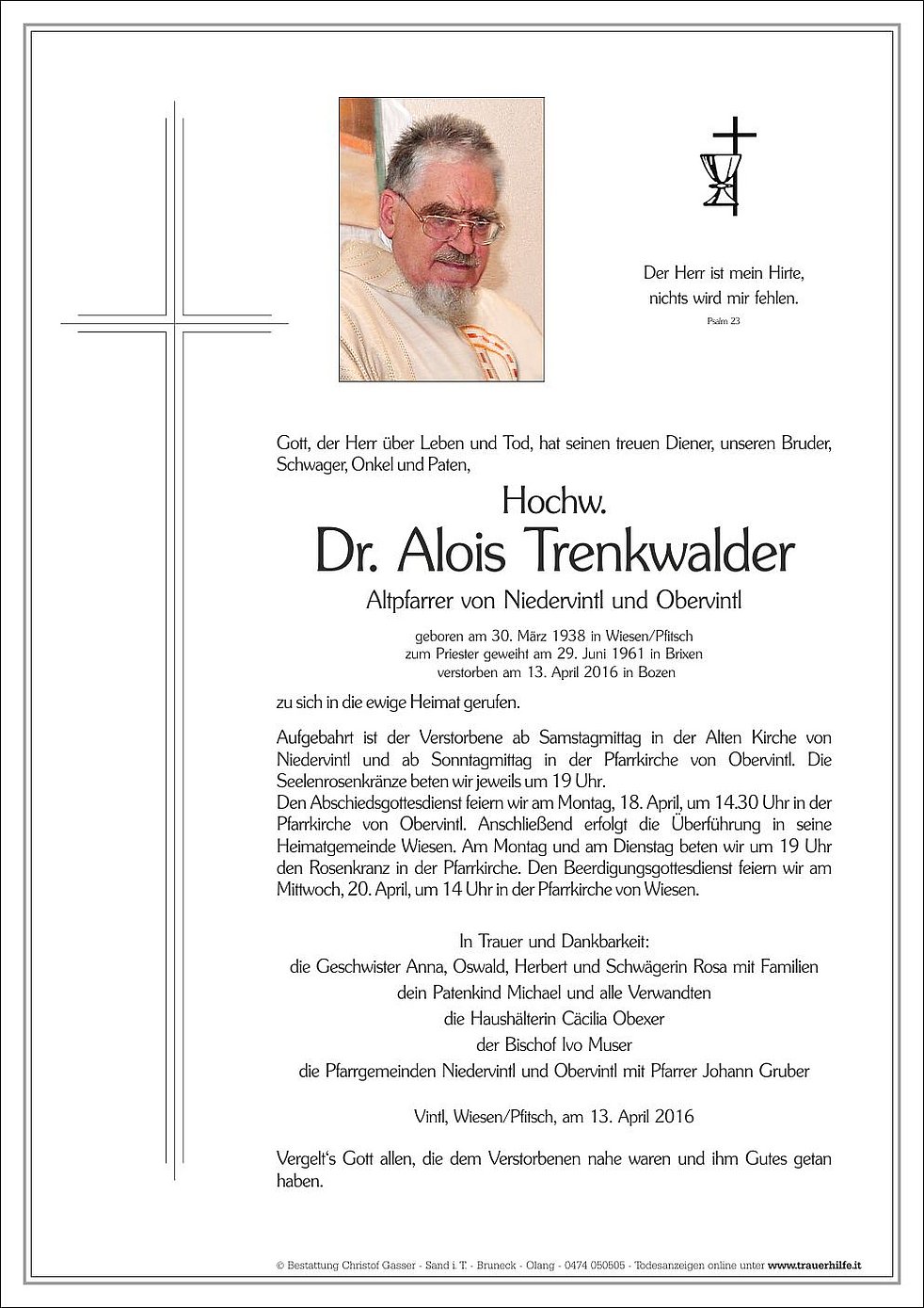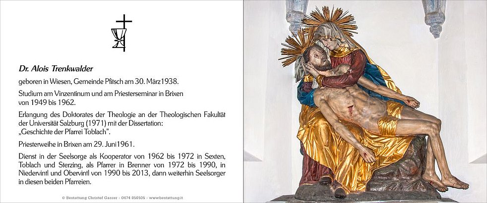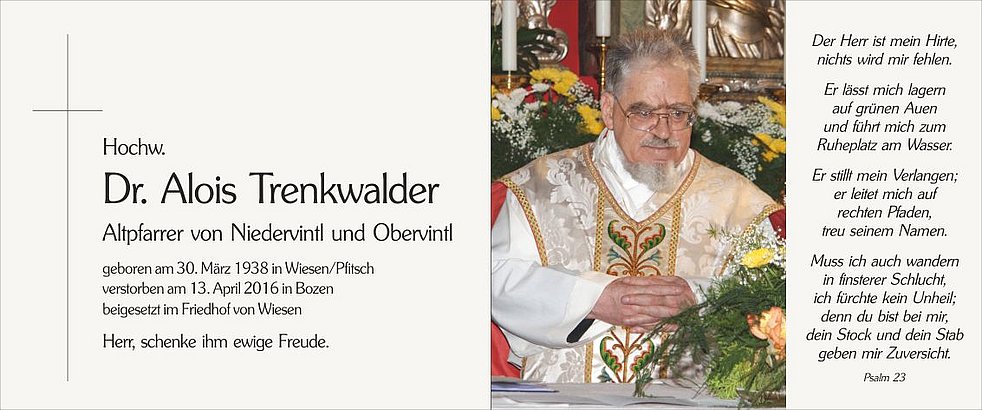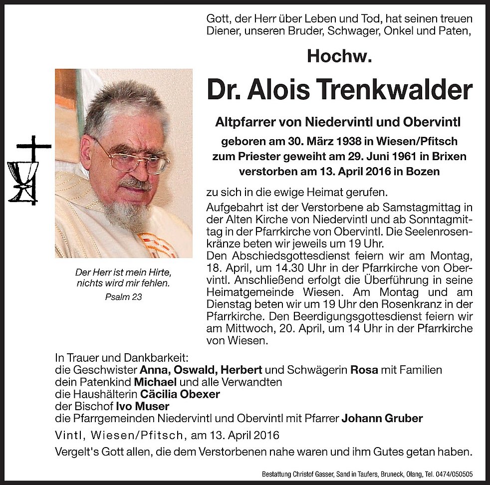 Den Abschiedsgottesdienst feiern wir am Montag, 18. April, um 14.30 Uhr in der Pfarrkirche von Obervintl. Anschließend erfolgt die Überführung in seine Heimatgemeinde Wiesen. Am Montag und am Dienstag beten wir um 19 Uhr den Rosenkranz in der Pfarrkirche. Den Beerdigungsgottesdienst feiern wir am Mittwoch, 20. April, um 14 Uhr in der Pfarrkirche von Wiesen.