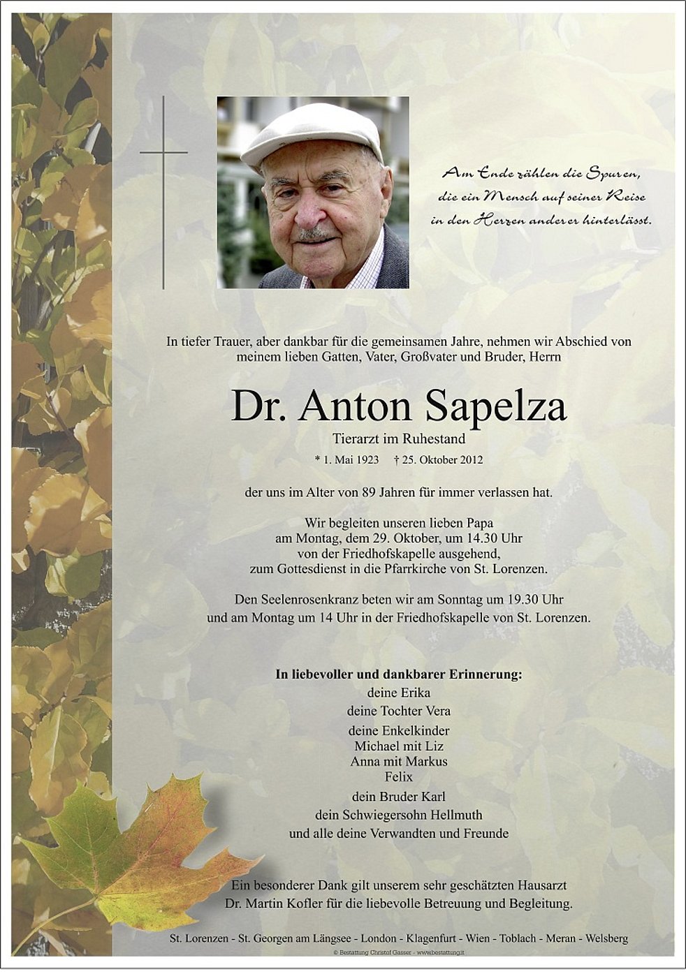 Vor 2 Jahren durfte ich Sie und Ihren lieben Gatten besuchen. Heute, Allerseelentag, werde ich in der Abendmesse besonders für Dr. Sapelza und für die Trauerfamilie beten. Möge Dr. Sapelza die Fülle des Lebens geniessen. Dr. Sapelza hat vielen Armen geholfen. Gottes Lohn wird nicht fehlen.
