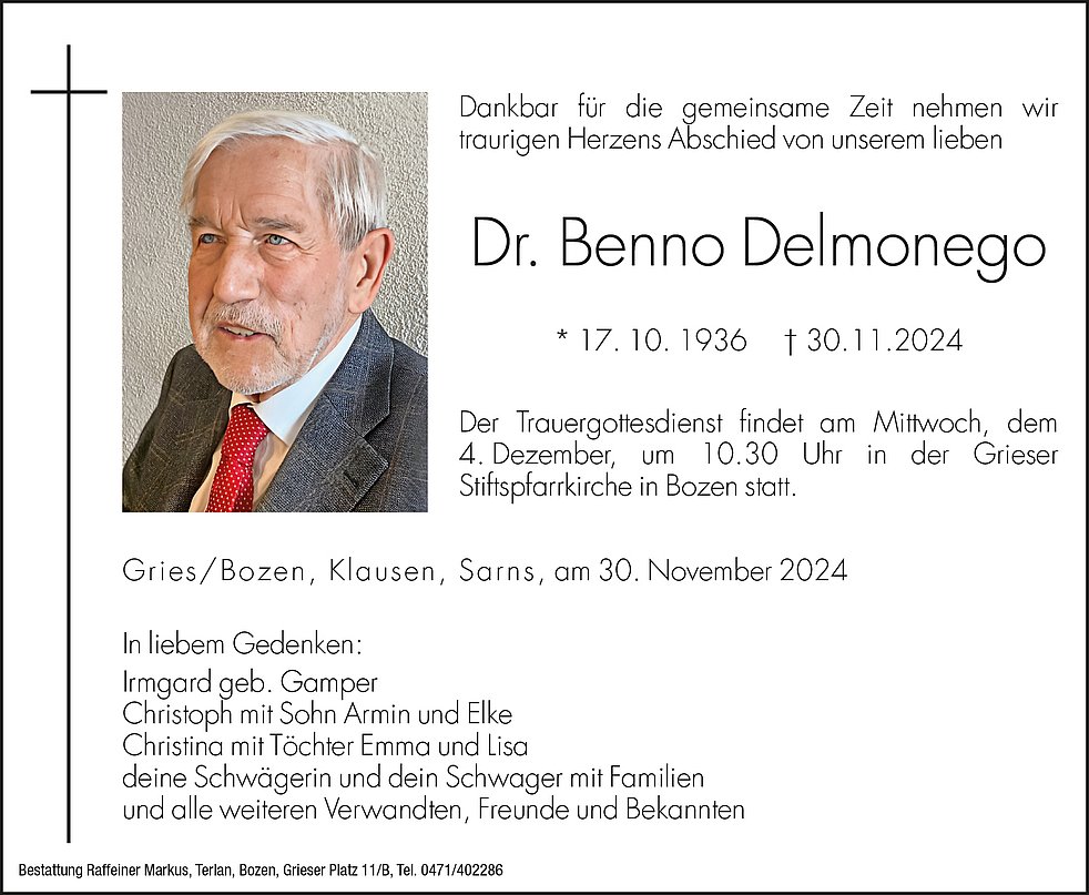 Der Trauergottesdienst findet am Mittwoch, dem 4. Dezember, um 10.30 Uhr in der Grieser Stiftspfarrkirche in Bozen statt.