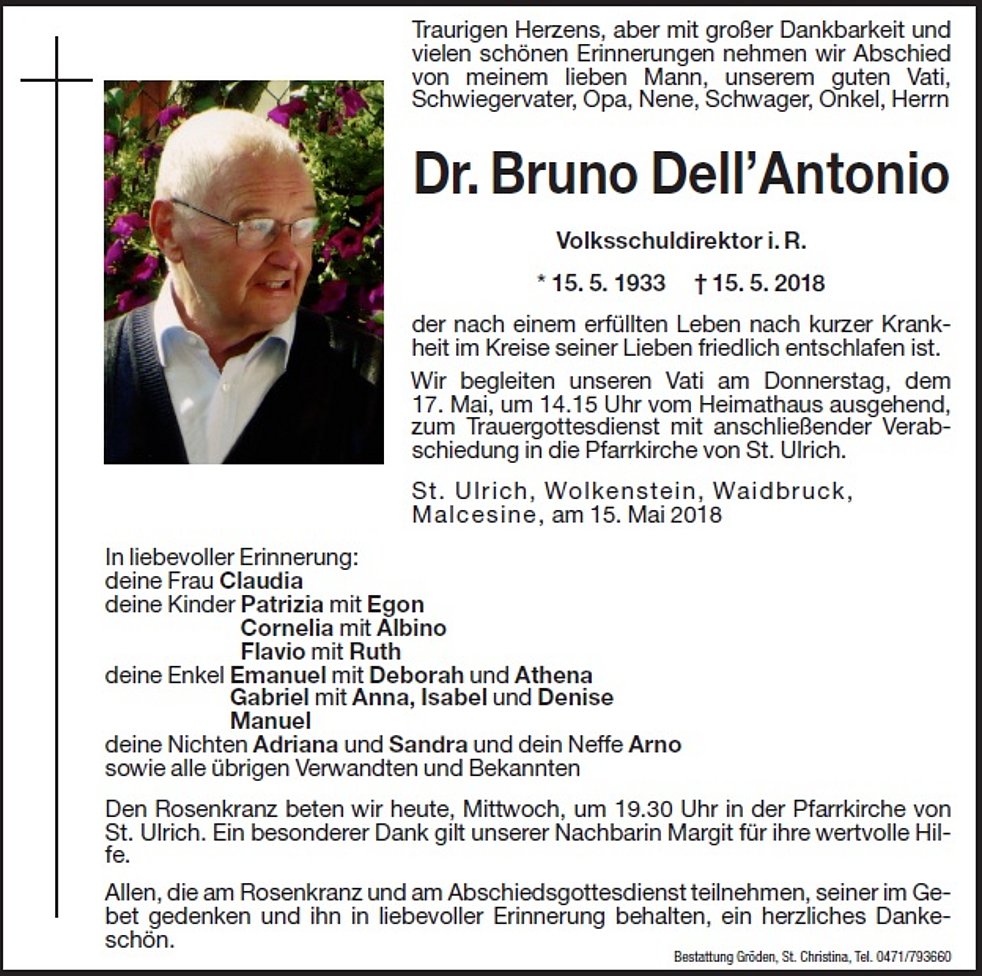 Wir begleiten unseren Vati am Donnerstag, dem 17. Mai, um 14.15 Uhr vom Heimathaus ausgehend, zum Trauergottesdienst mit anschließender Verabschiedung in die Pfarrkirche von St. Ulrich.