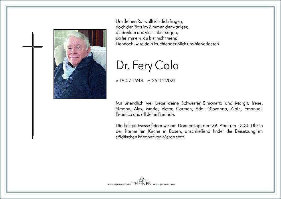 Die heilige Messe feiern wir am Donnerstag, den 29. April um 13.30 Uhr in der Karmeliten Kirche in Bozen, anschließend findet die Beisetzung im städtischen Friedhof von Meran statt.