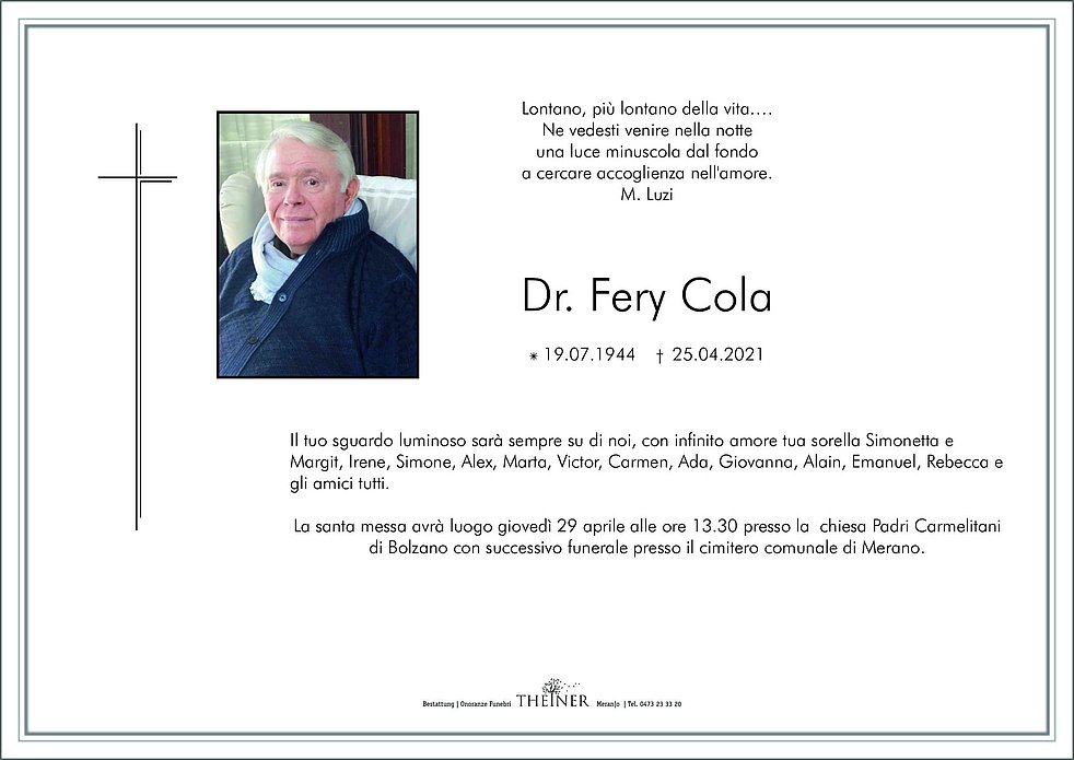 La santa messa avrà luogo giovedì 29 aprile alle ore 13.30 presso la chiesa Padri Carmelitani di Bolzano con successivo funerale presso il cimitero comunale di Merano.