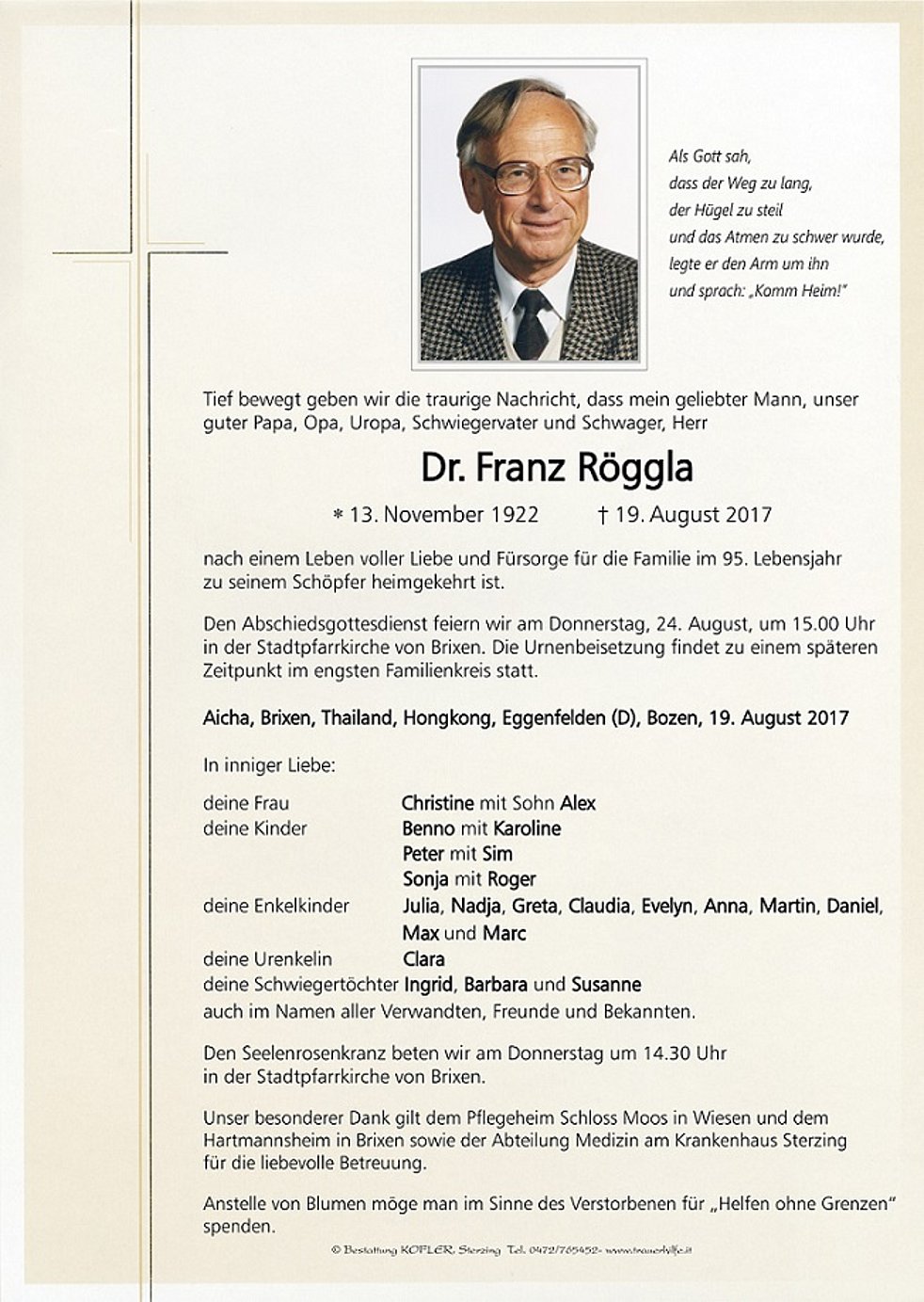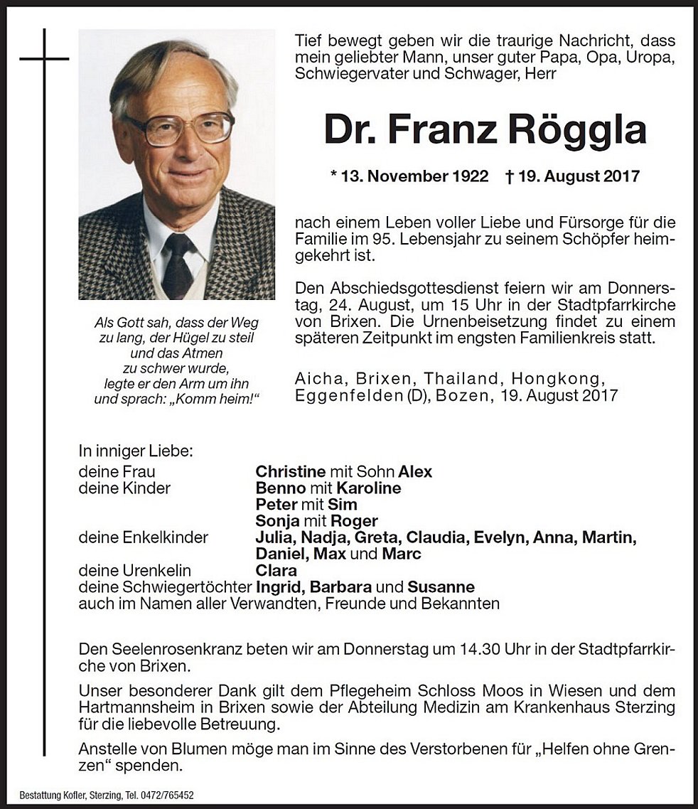 Den Abschiedsgottesdienst feiern wir am Donnerstag, 24. August, um 15.00 Uhr in der Stadtpfarrkirche von Brixen. Die Urnenbeisetzung findet zu einem späteren Zeitpunkt im engsten Familienkreis statt.