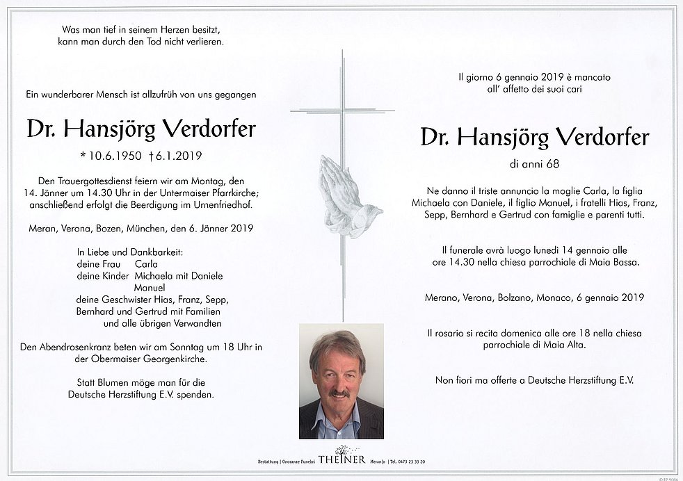 Ne danno il triste annuncio la moglie Carla, la figlia Michaela con Daniele, il figlio Manuel, i fratelli Hias, Franz, Sepp, Bernhard e Gertrud con famiglie e parenti tutti.