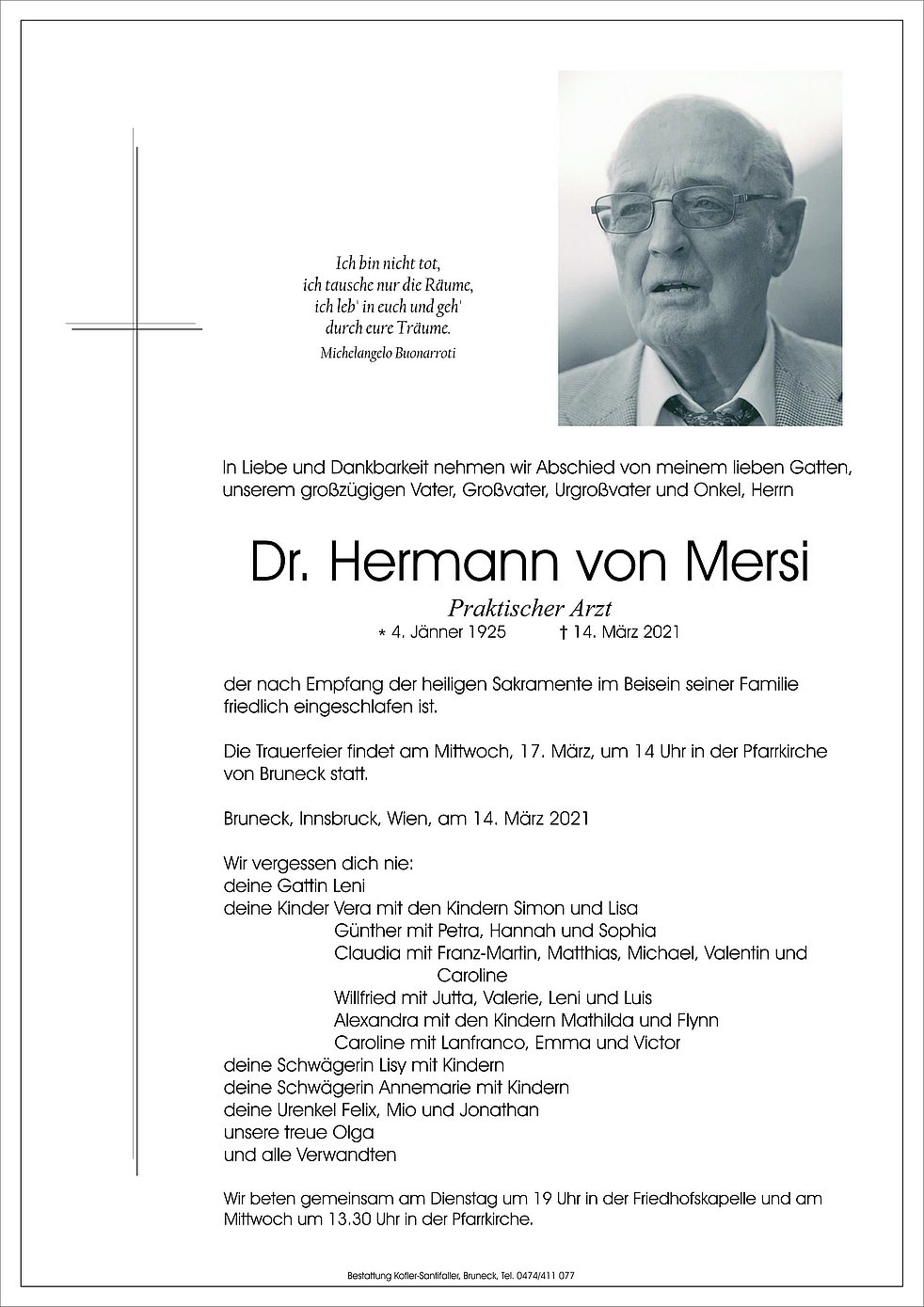 Zum Heimgang Eures Mannes/Eures Vaters möchten auch wir Euch unser innigstes Mitgefühl aussprechen. Wir wünschen Euch Kraft und Trost für die dunklen Stunden der Trauer. Gerne erinnern wir uns an die vielen Besuche von Herrn Mersi, und werden ihn als geschätzten Menschen in Einnerung behalten.