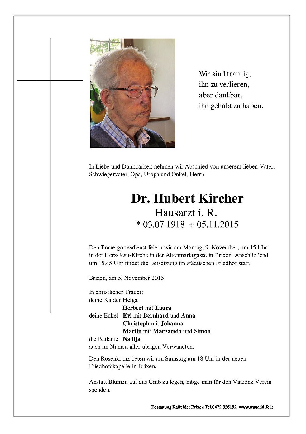 Den Trauergottesdienst feiern wir am Montag, 9. November um 15 Uhr in der Herz-Jesu-Kirche in der Altenmarktgasse in Brixen. Anschließend um 15.45 Uhr findet die Beisetzung im städtischen Friedhof statt.