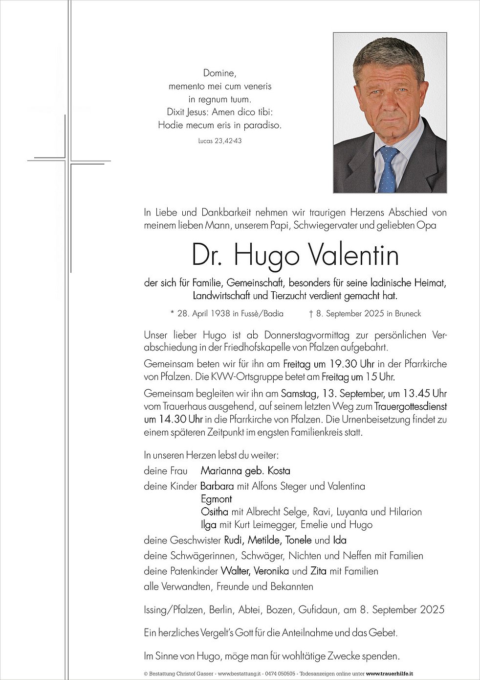 Unser lieber Hugo ist ab Donnerstagvormittag zur persönlichen Verabschiedung in der Friedhofskapelle von Pfalzen aufgebahrt.