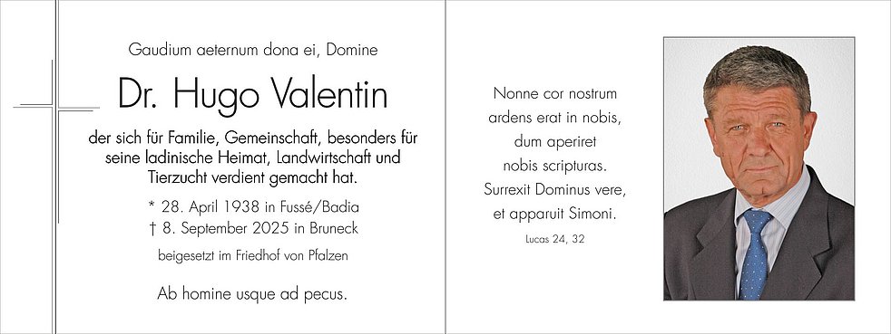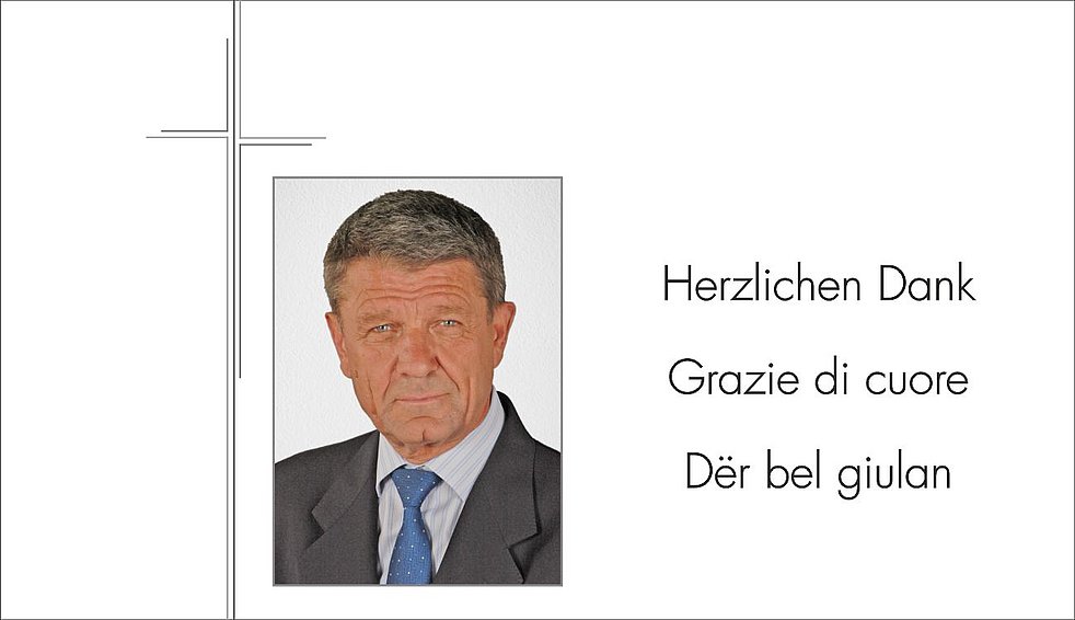 Gemeinsam begleiten wir ihn am Samstag, 13. September, um 13.45 Uhr vom Trauerhaus ausgehend, auf seinem letzten Weg zum Trauergottesdienst um 14.30 Uhr in die Pfarrkirche von Pfalzen. Die Urnenbeisetzung findet zu einem späteren Zeitpunkt im engsten Familienkreis statt.