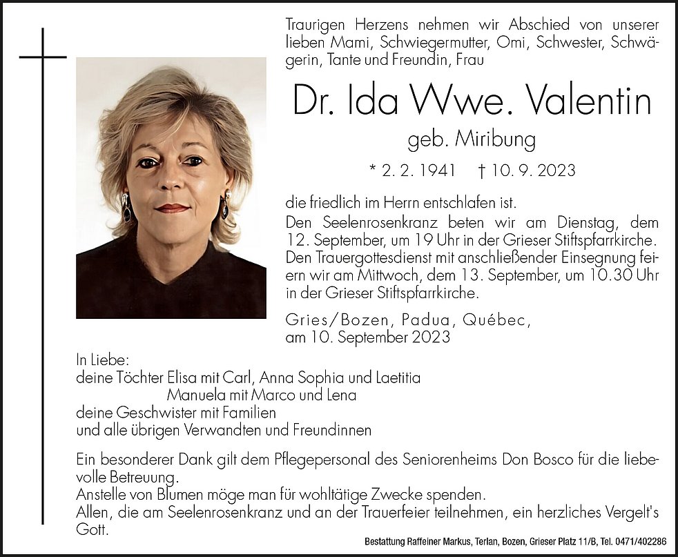 Den Trauergottesdienst mit anschließender Einsegnung feiern wir am Mittwoch, dem 13. September, um 10.30 Uhr in der Grieser Stiftspfarrkirche.