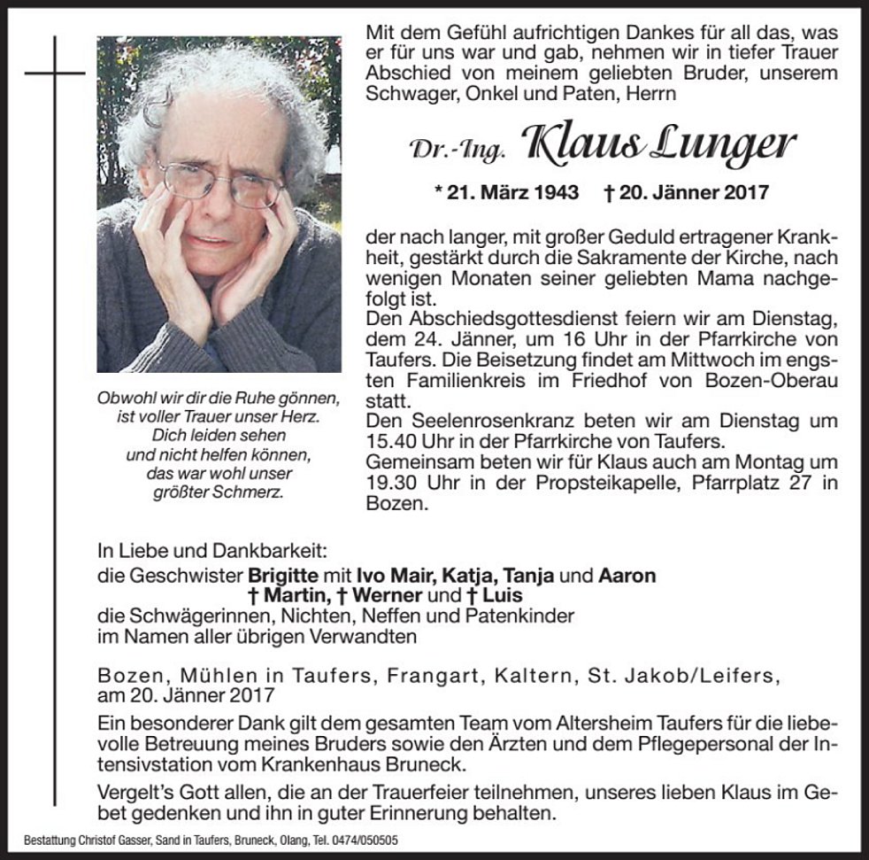 Ein besonderer Dank gilt dem gesamten Team vom Altersheim Taufers für die liebevolle Betreuung meines Bruders sowie den Ärzten und dem Pflegepersonal der Intensivstation vom Krankenhaus Bruneck.