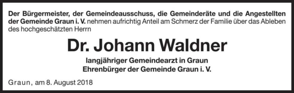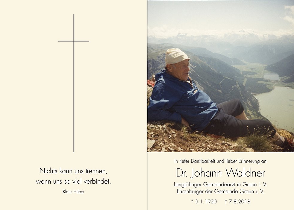Wir begleiten unseren lieben Neina am Freitag, 10. August, um 14 Uhr vom „Hiasa-Kreuz“ ausgehend zum Begräbnisgottesdienst in die Pfarrkirche; anschließend Beisetzung im Ortsfriedhof von Graun i. V.