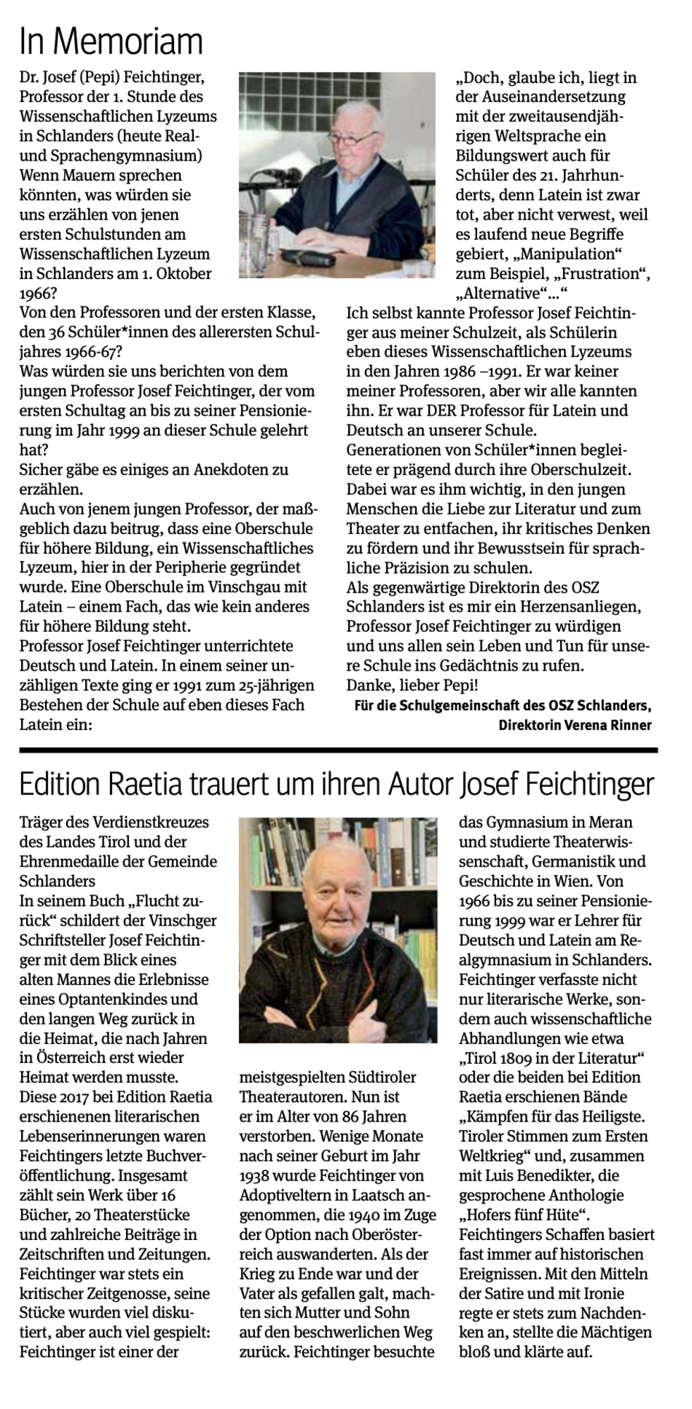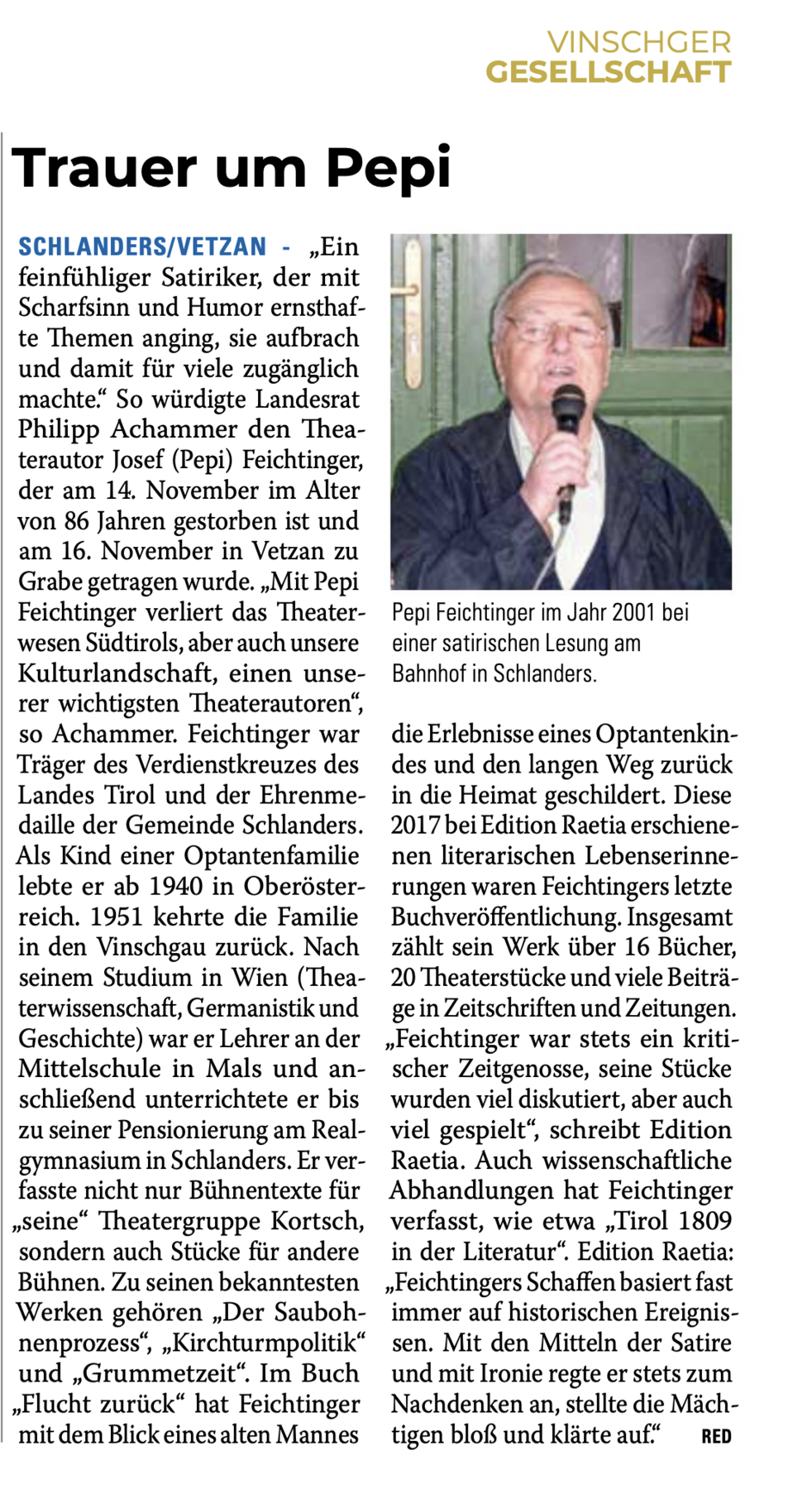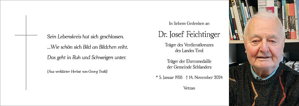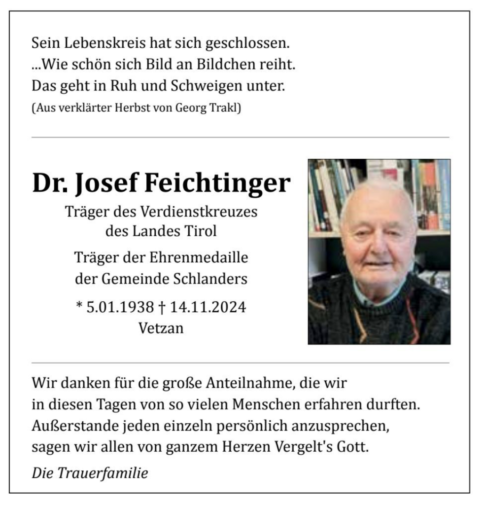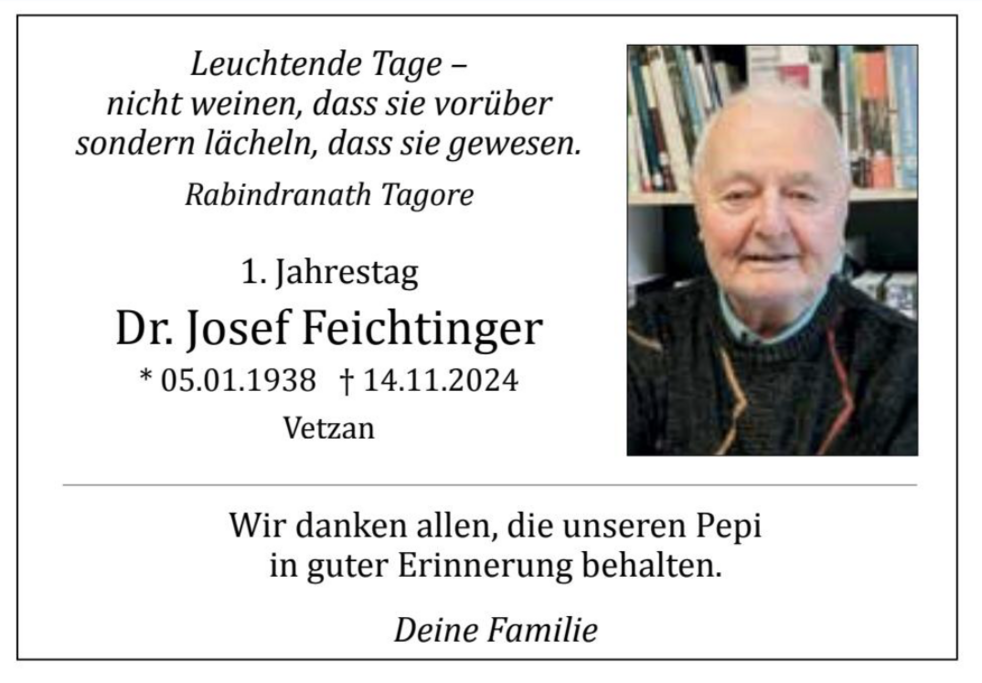 Den Begräbnisgottesdienst für unseren lieben Pepi feiern wir am Samstag, 16. November, um 13.30 Uhr in der St.-Nikolaus-Kirche; anschließend erfolgt die Verabschiedung im Ortsfriedhof von Vetzan.
