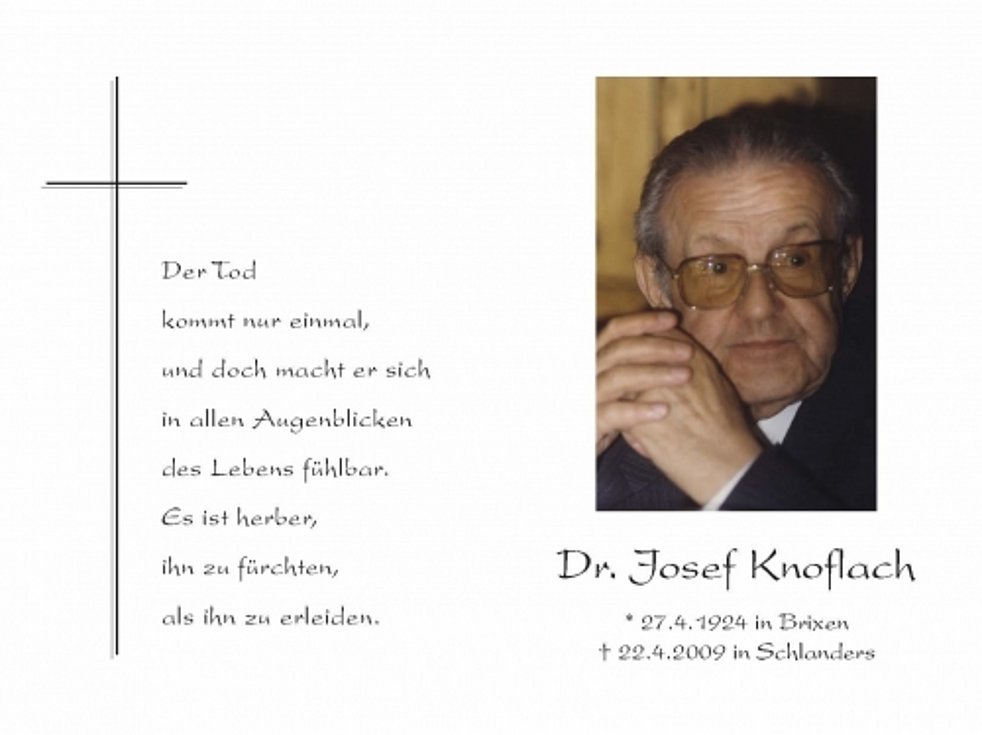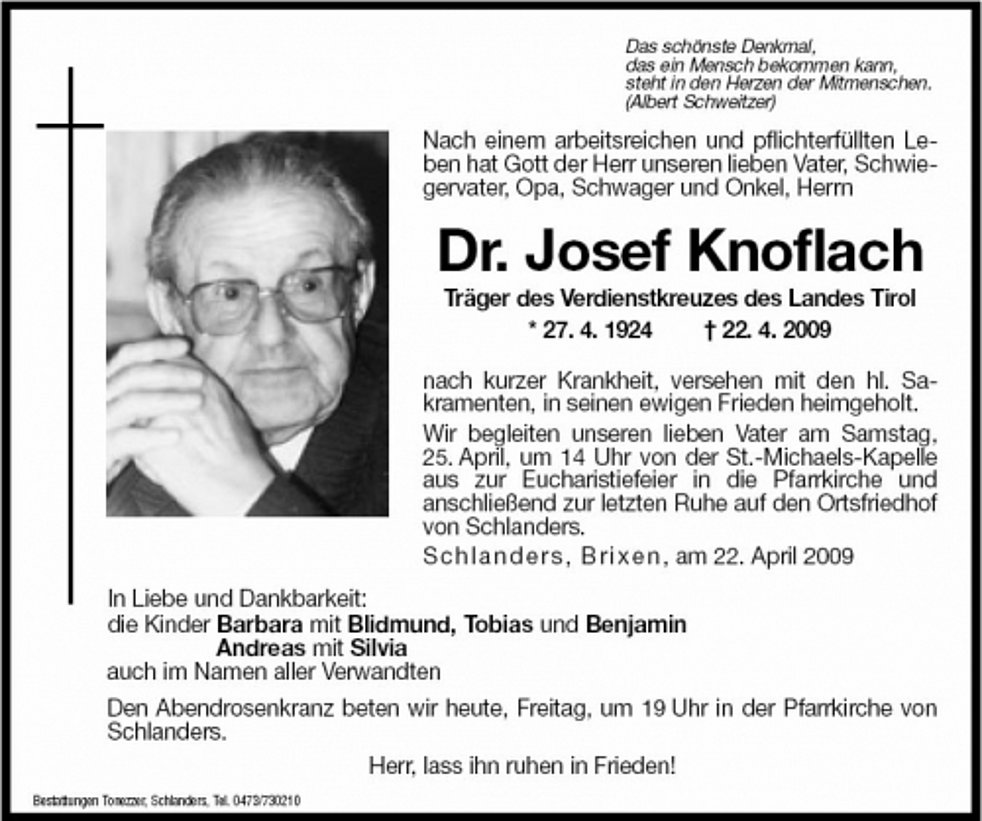 Wir begleiten unseren lieben Vater am Samstag, 25. April, um 14 Uhr von der St. Michaels-Kapelle aus zur Eucharistiefeier in die Pfarrkirche und anschließend zur letzten Ruhe auf den Ortsfriedhof von Schlanders.