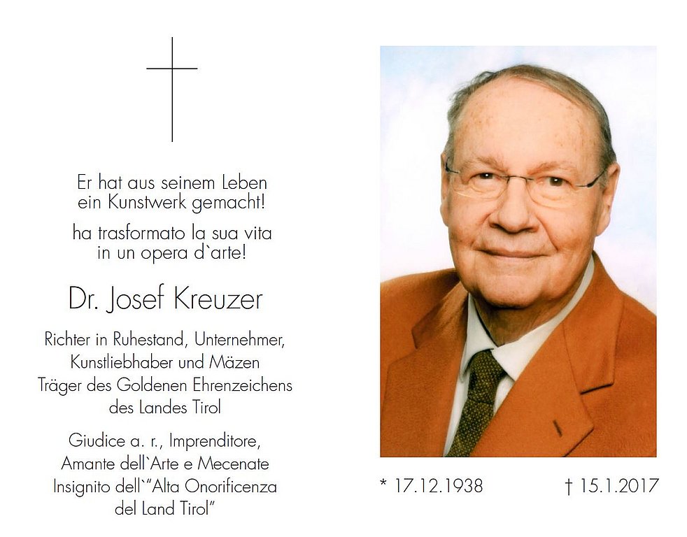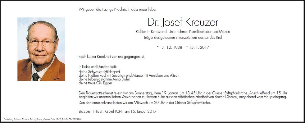 Den Trauergottesdienst feiern wir am Donnerstag, dem 19. Januar, um 13.45 Uhr in der Grieser Stiftspfarrkirche. Anschlieβend um 15 Uhr begleiten wir unseren lieben Verstorbenen zur letzten Ruhe auf den städtischen Friedhof von Bozen-Oberau, ausgehend vom Haupteingang.