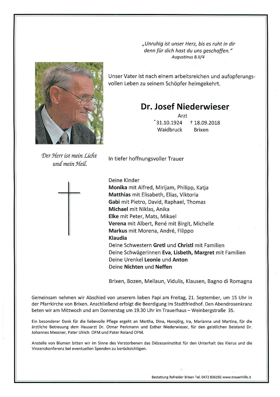 Gemeinsam nehmen wir Abschied von unserem lieben Vater am Freitag, 21. September, um 15 Uhr in der Pfarrkirche von Brixen. Anschließend erfolgt die Beerdigung im Stadtfriedhof.