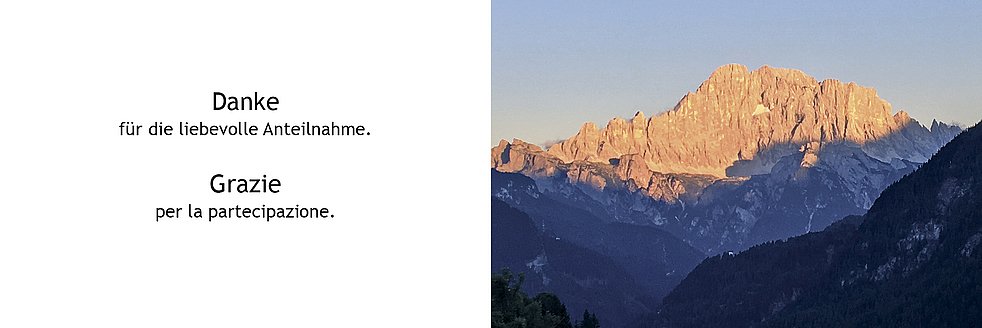 Gedankt sei dem Hausarzt Dr. Bruno Letrari, dem Krankenpflegedienst Brixen, der Abteilung Medizin und Dermatologie-Ambulanz des Krankenhauses Brixen, sowie dem Pflegepersonal des Bürgerheimes Brixen, 2. Wohnbereich, für die kompetente und liebevolle Betreuung.