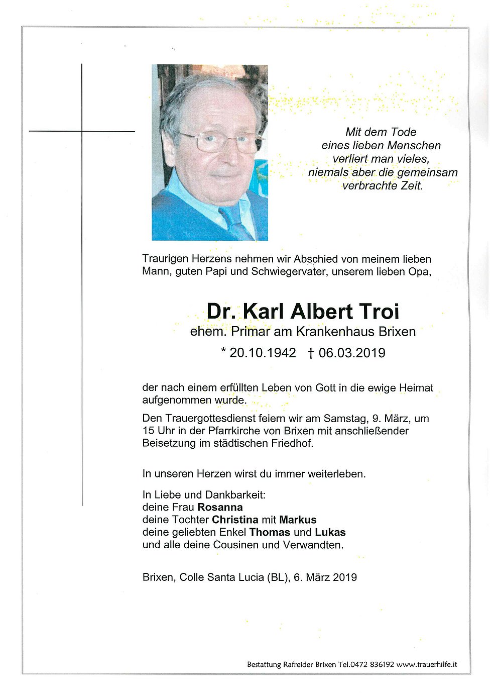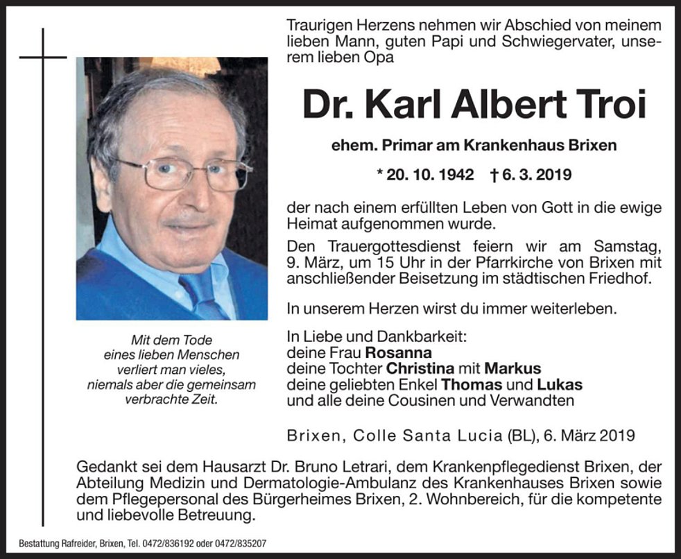 Den Trauergottesdienst feiern wir am Samstag, 9. März, um 15 Uhr in der Pfarrkirche von Brixen mit anschließender Beisetzung im städtischen Friedhof.