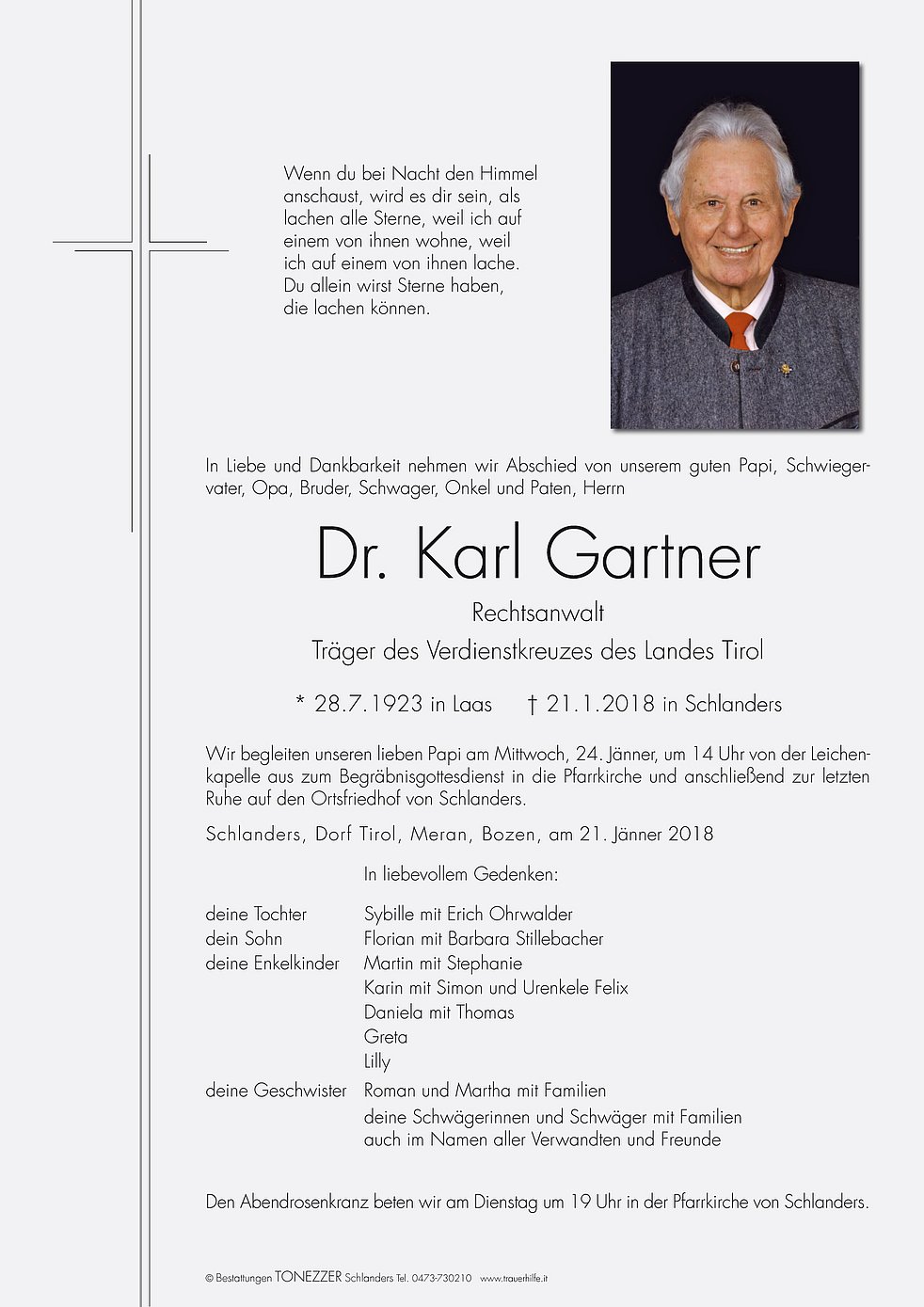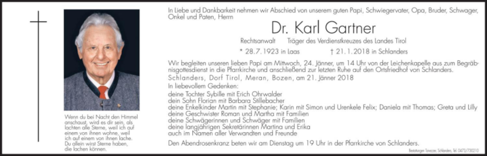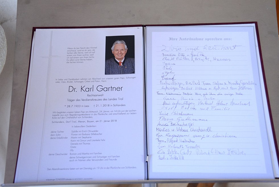 Wir begleiten unseren lieben Papi am Mittwoch, 24. Jänner, um 14 Uhr von der Leichenkapelle aus zum Begräbnisgottesdienst in die Pfarrkirche und anschließend zur letzten Ruhe auf den Ortsfriedhof von Schlanders.