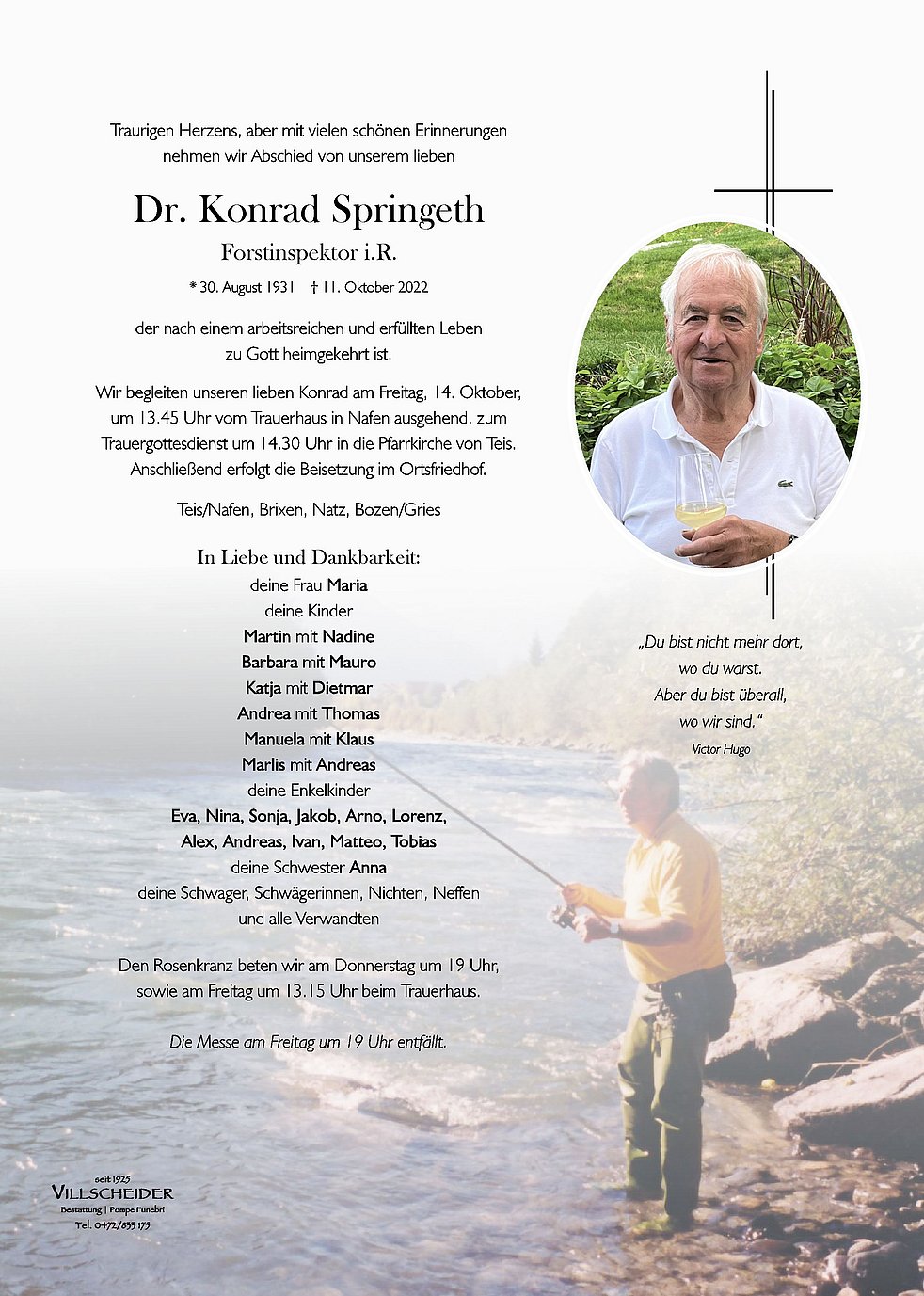 Lang ists her, seit ich als junger Spund in der Forststation Brixen deine Bekanntschaft machen durfte. Dein sonniges Wesen war ansteckend, deine Menschenfreundlichkeit prägend. Unvergesslich deine ansteckende gesellige Art bei forstlichen Arbeiten und unzähligen geselligen Stunden. Wünsche dir, lieber Konrad auf deiner Reise, die wir alle einmal antreten werden, dass dich unser Schöpfer freundlich aufhängt und möchte allen deinen Lieben, die um dich trauern, mein herzliches Mitgefühl ausdrücken.