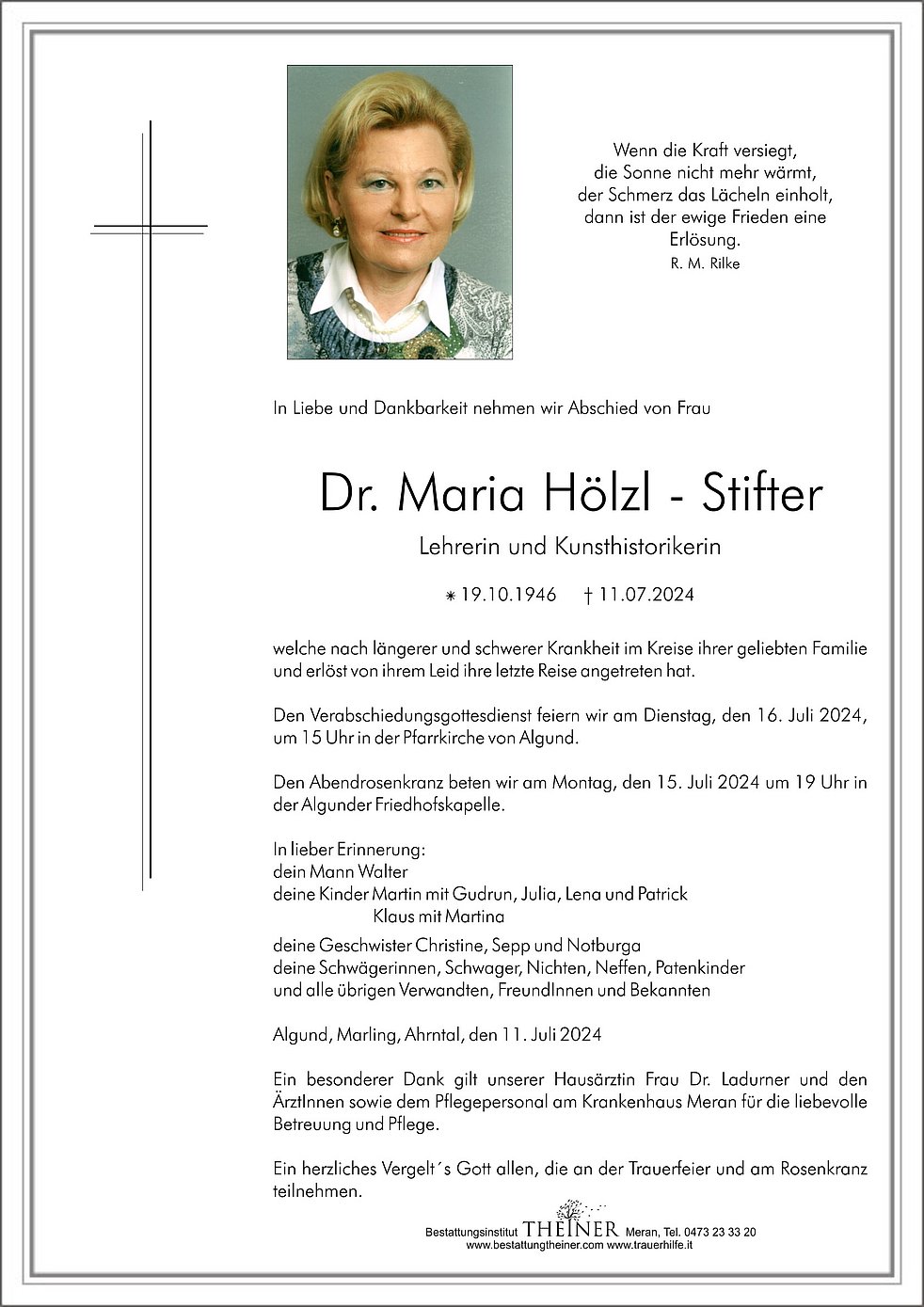 Ein besonderer Dank gilt unserer Hausärztin Frau Dr. Ladurner und den ÄrztInnen sowie dem Pflegepersonal am Krankenhaus Meran für die liebevolle Betreuung und Pflege.