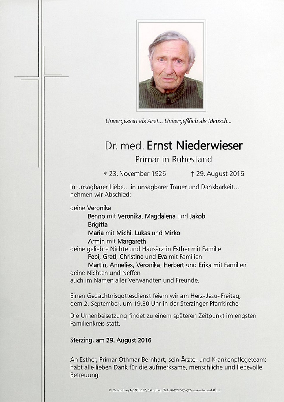 Einen Gedächtnisgottesdienst feiern wir am Herz- Jesu- Freitag, dem 2. September, um 19.30 Uhr in der Sterzinger Pfarrkirche.