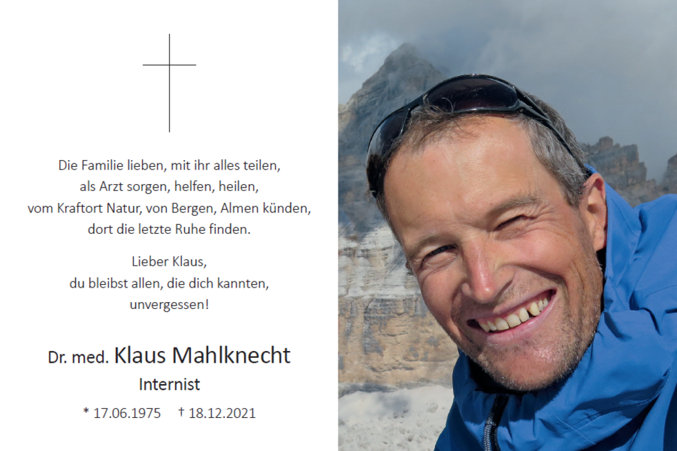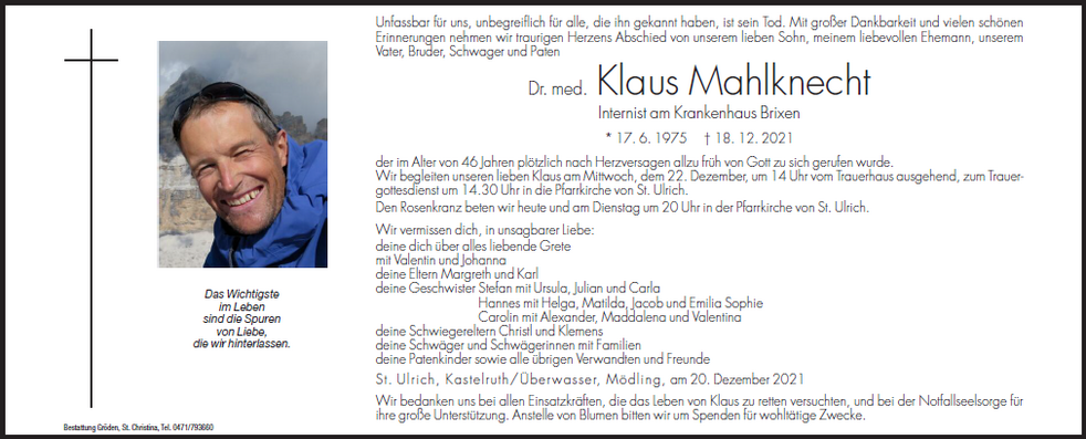 Wir begleiten unseren lieben Klaus am Mittwoch, dem 22. Dezember, um 14 Uhr vom Trauerhaus ausgehend, zum Trauergottesdienst um 14.30 Uhr in die Pfarrkirche von St.Ulrich.
