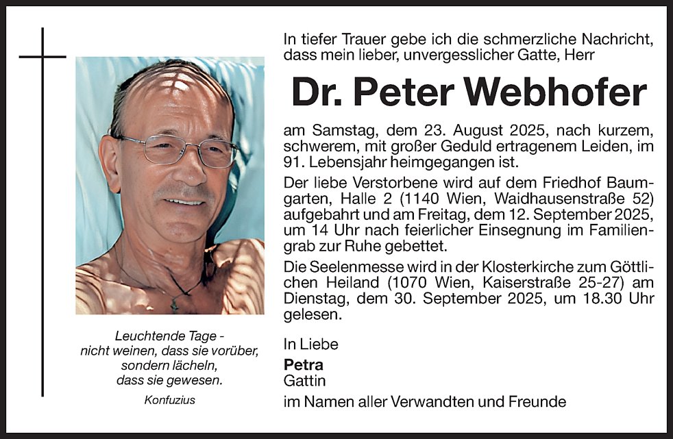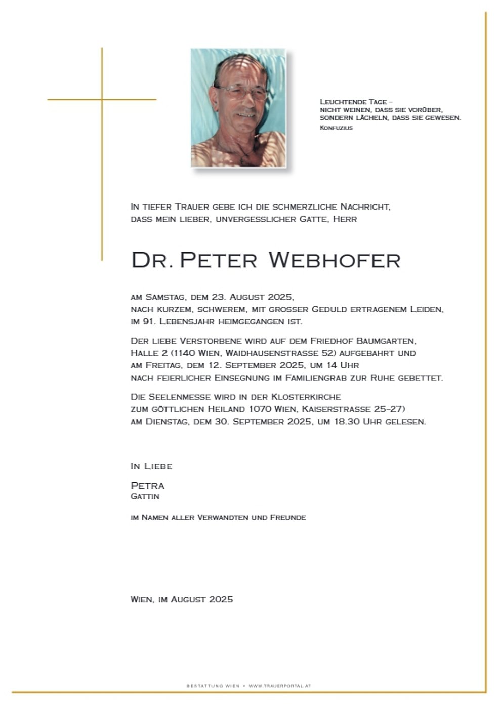Der liebe Verstorbene wird auf dem Friedhof Baumgarten, Halle 2 (1140 Wien, Waidhausenstrasse 52) aufgebahrt und am Freitag, dem 12. September 2025, um 14 Uhr nach feierlicher Einsegnung im Familiengrab zur Ruhe gebettet.