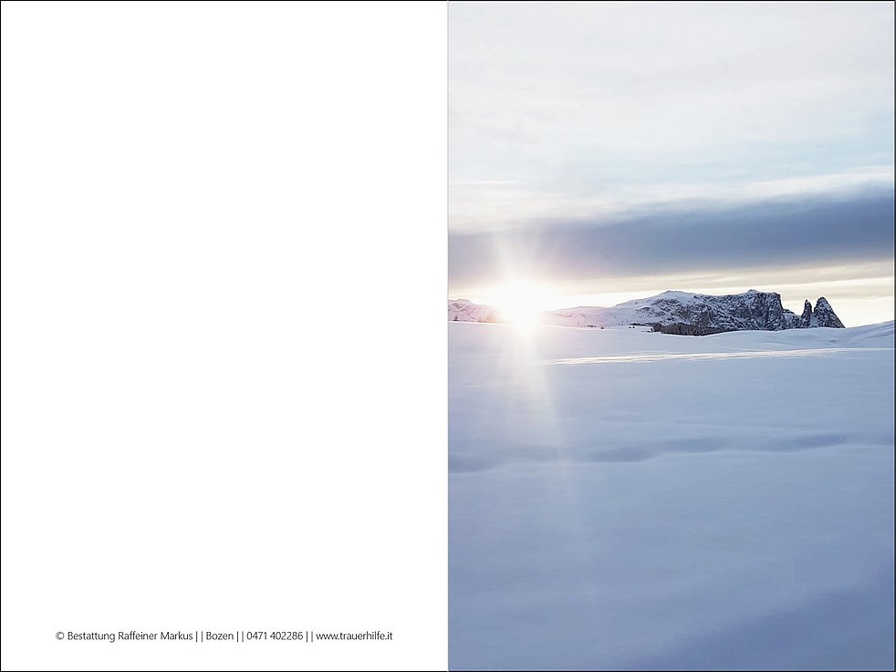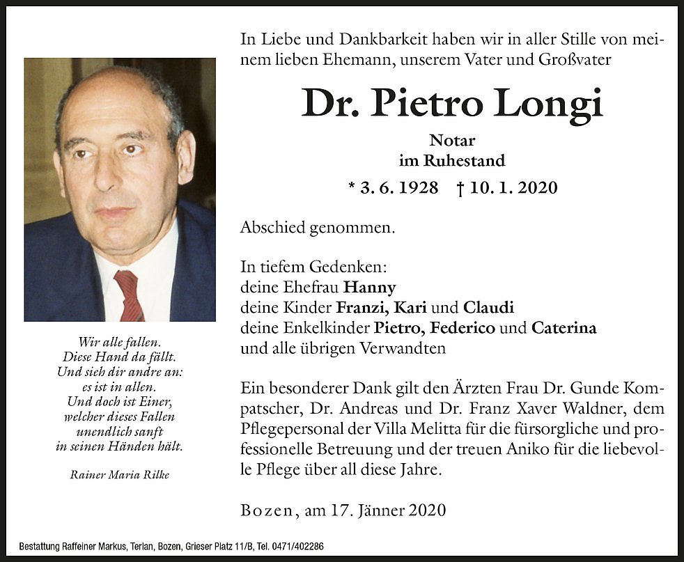 Ein besonderer Dank gilt den Ärzten Frau Dr. Gunde Kompatscher, Dr. Andreas und Dr. Franz Xaver Waldner, dem Pflegepersonal der Villa Melitta für die fürsorgliche und professionelle Betreuung und der treuen Aniko für die liebevolle Pflege über all diese Jahre.