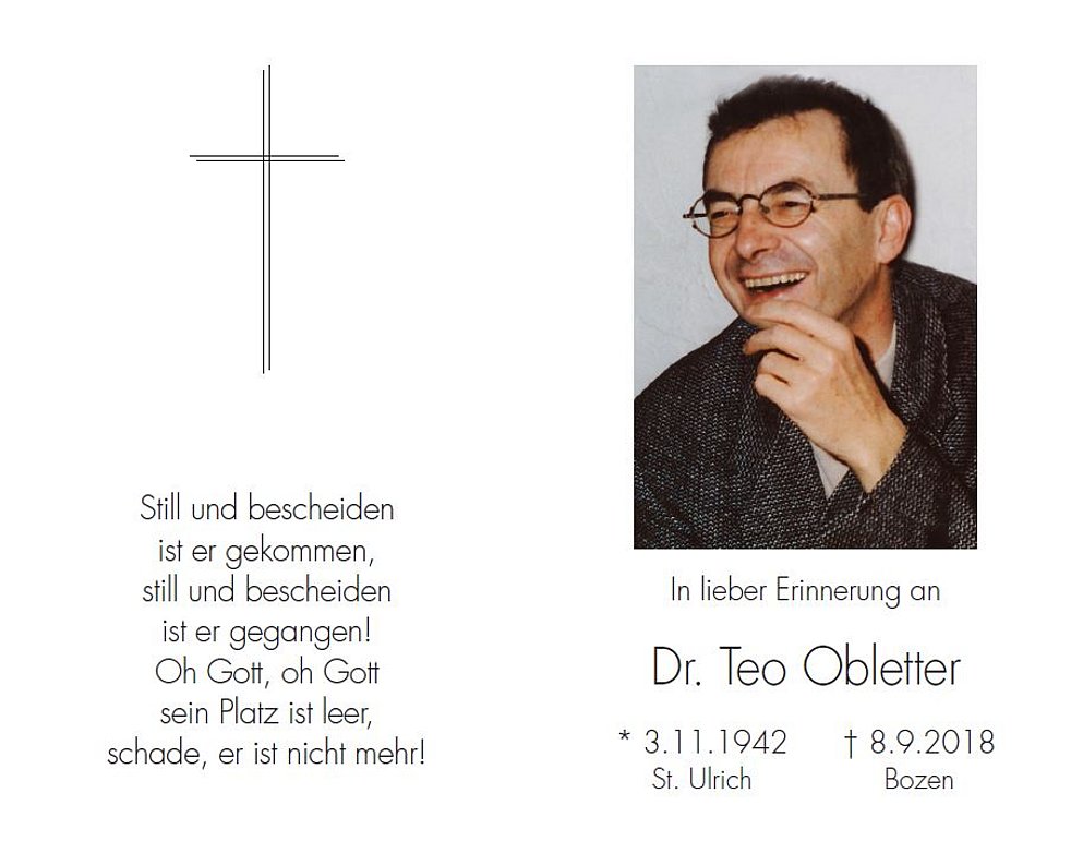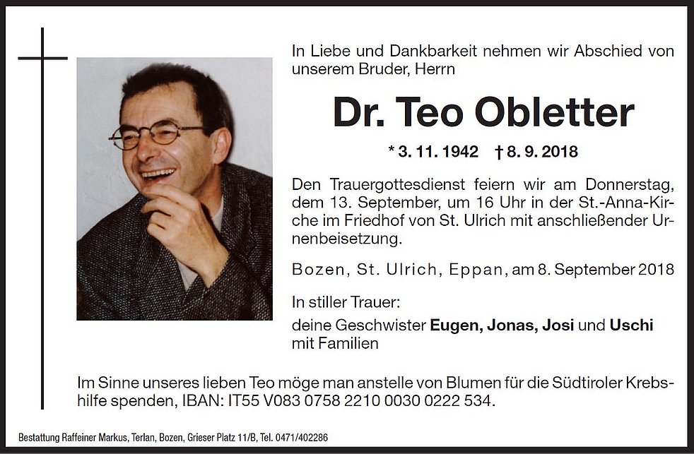 Im Sinne unseres lieben Teo, möge man statt Blumen an die Südtiroler Krebshilfe spenden. IBAN: IT55V0830758221000300222534
