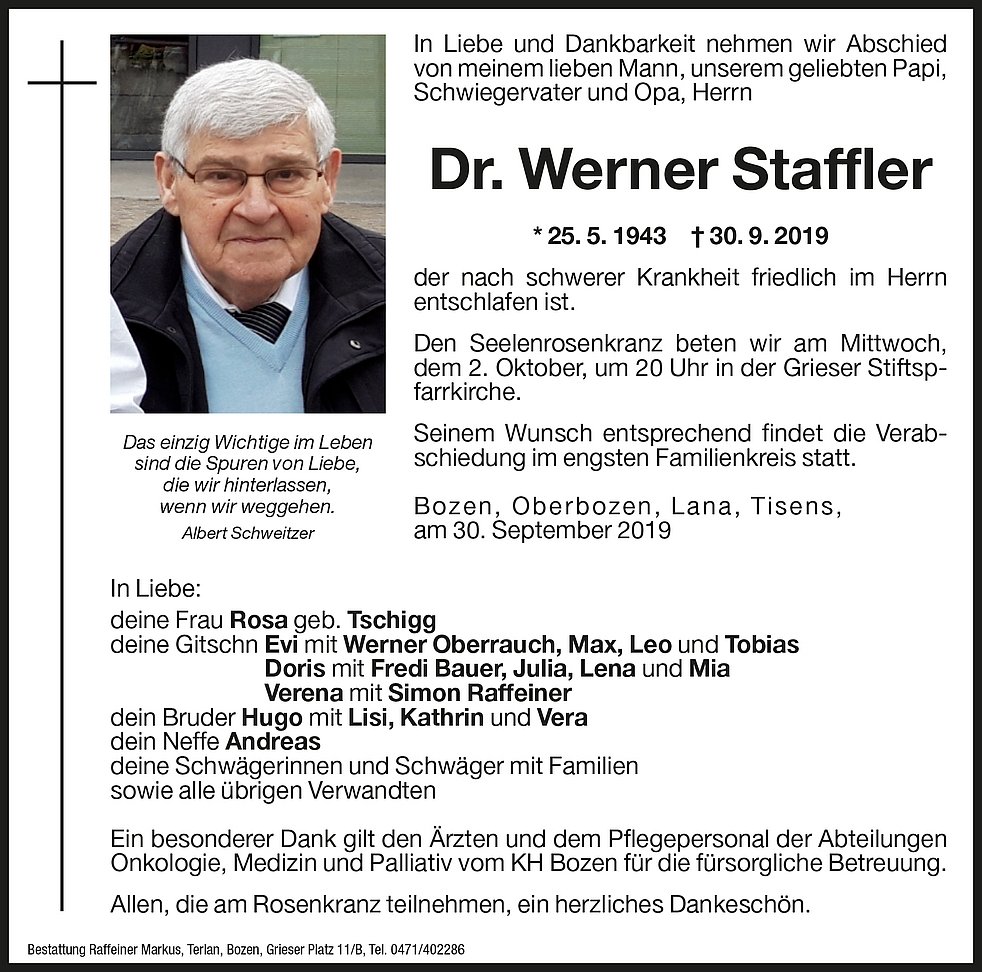 Ein besonderer Dank gilt den Ärzten und dem Pflegepersonal der Abteilungen Onkologie, Medizin und Palliativ vom KH Bozen für die fürsorgliche Betreuung.