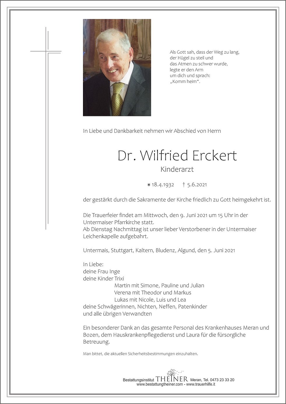 Die Trauerfeier findet am Mittwoch, den 9. Juni 2021 um 15 Uhr in der Untermaiser Pfarrkirche statt.
