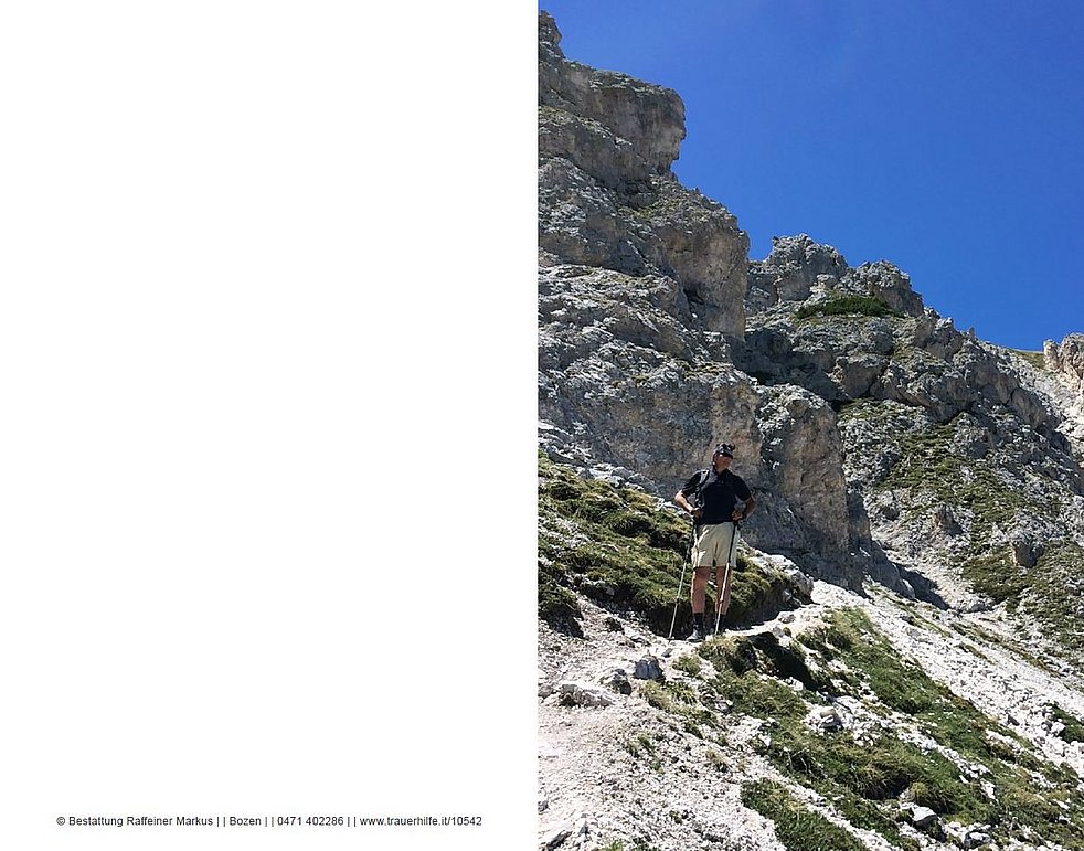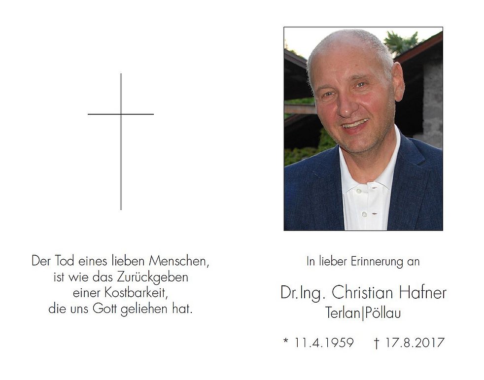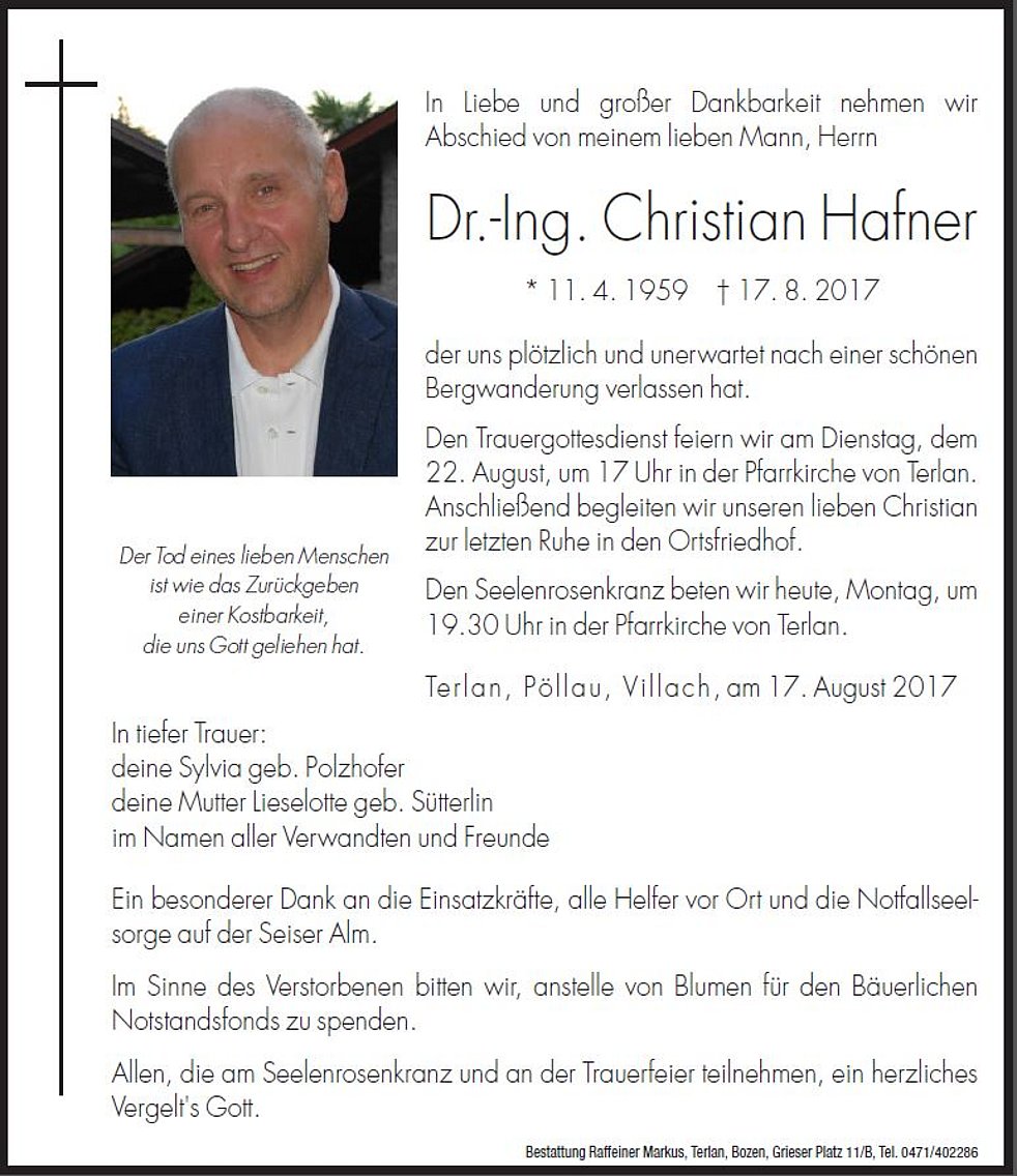 Den Trauergottesdienst feiern wir am Dienstag, dem 22. August, um 17 Uhr in der Pfarrkirche von Terlan. Anschließend begleiten wir unseren lieben Christian zur letzten Ruhe in den Ortsfriedhof.