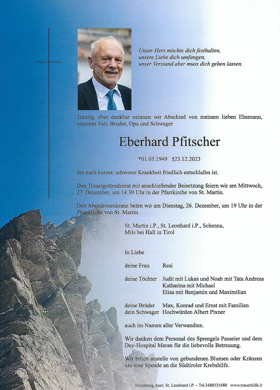 Wir bitten anstelle von gebundenen Blumen oder Kränzen um eine Spende an die Südtiroler Krebshilfe.