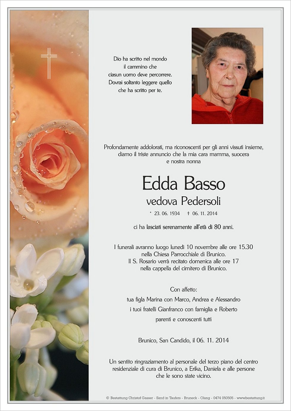 Un sentito ringraziamento al personale del terzo piano del centro residenziale di cura di Brunico, a Erika, Daniela e alle persone che le sono state vicino.