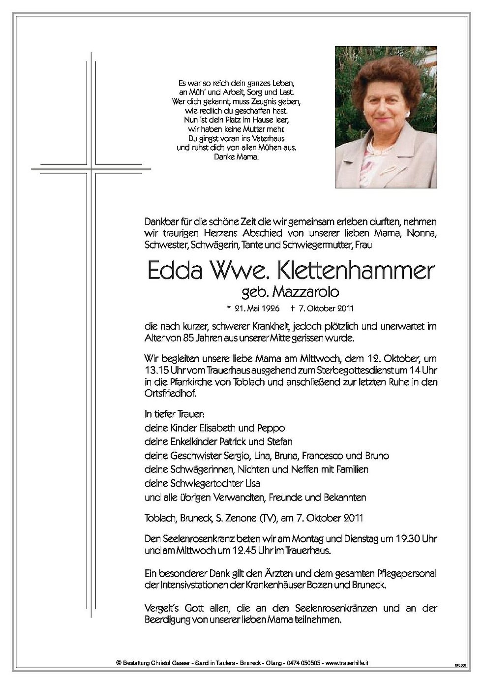 Wir begleiten unsere liebe Mama am Mittwoch, dem 12. Oktober, um 13.15 Uhr vom Trauerhaus ausgehend zum Sterbegottesdienst um 14 Uhr in die Pfarrkirche von Toblach und anschließend zur letzten Ruhe in den Ortsfriedhof.