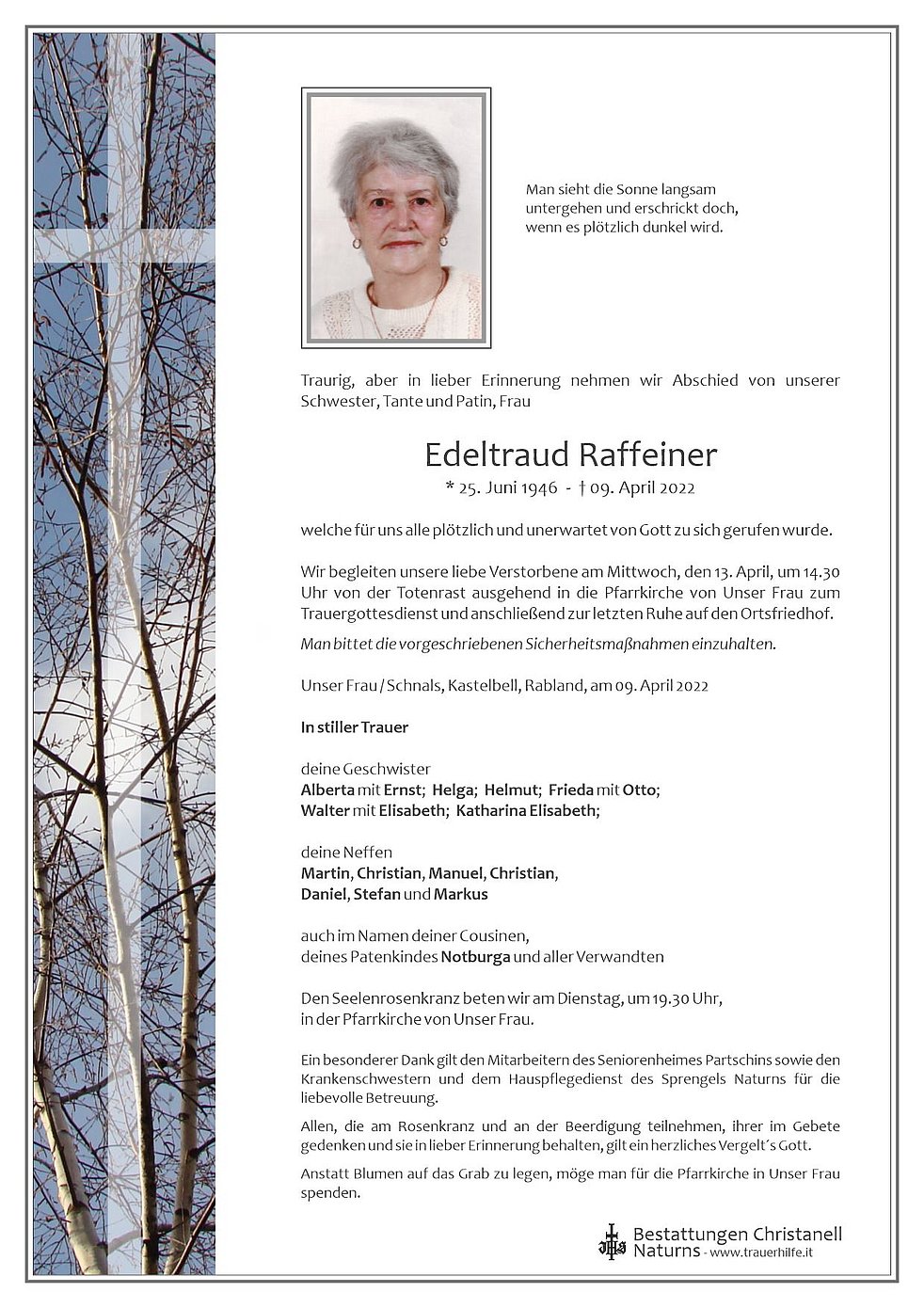 Wir begleiten unsere liebe Verstorbene am Mittwoch, den 13. April, um 14.30 Uhr von der Totenrast ausgehend in die Pfarrkirche von Unser Frau zum Trauergottesdienst und anschließend zur letzten Ruhe auf den Ortsfriedhof.