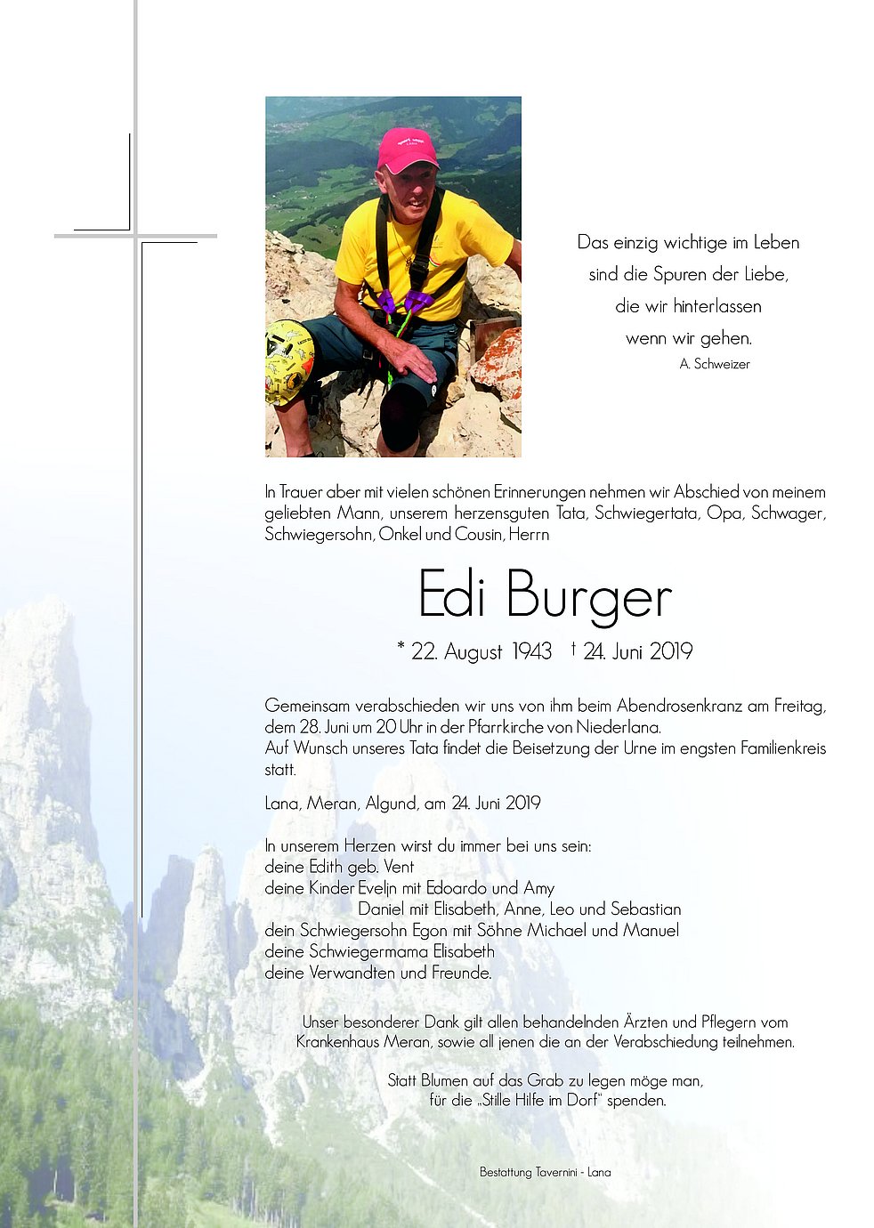 Unser Beileid zum Verlust eures geliebten Edi.In diesen schweren Stunden der Trauer wuenschen wir viel Kraft. Despar Pircher Lana und Mitarbeiter.