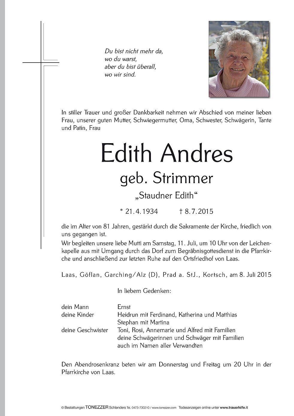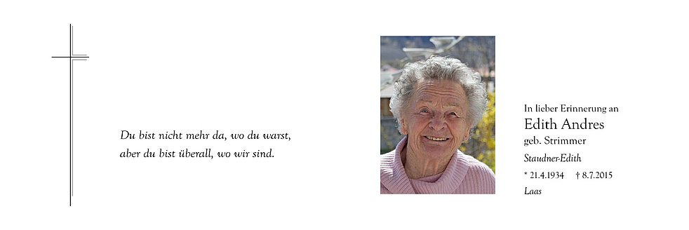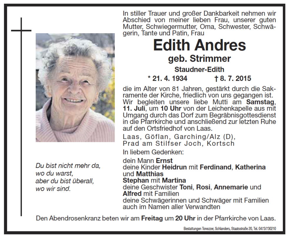 Wir begleiten unsere liebe Mutti am Samstag, 11. Juli, um 10 Uhr von der Leichenkapelle aus mit Umgang durch das Dorf zum Begräbnisgottesdienst in die Pfarrkirche und anschließend zur letzten Ruhe auf den Ortsfriedhof von Laas.