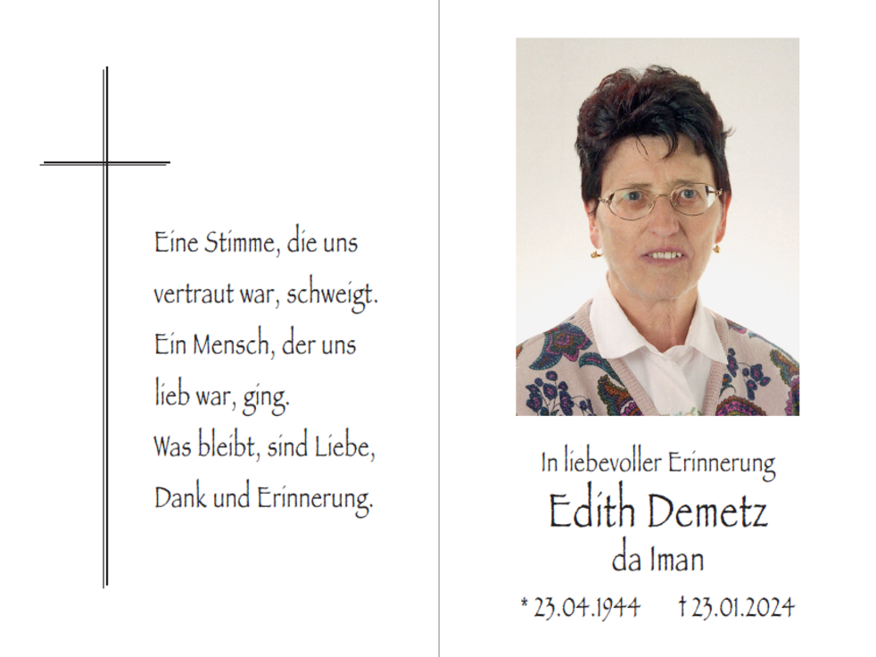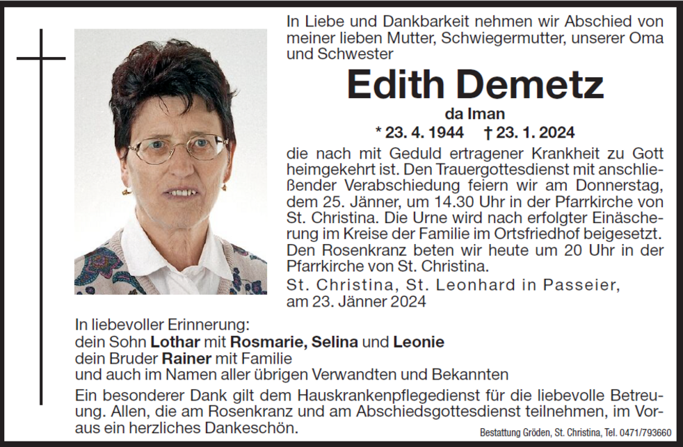 Den Trauergottesdienst mit anschließender Verabschiedung feiern wir am Donnerstag, dem 25. Jänner, um 14.30 Uhr in der Pfarrkirche von St. Christina. Die Urne wird nach erfolgter Einäscherung im Kreise der Familie im Ortsfriedhof beigesetzt.