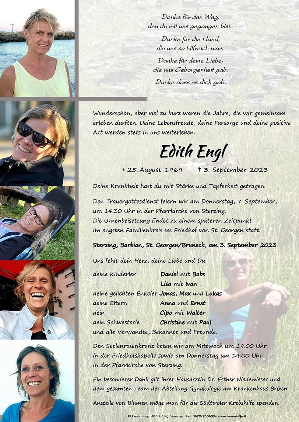 Den Trauergottesdienst feiern wir am Donnerstag, 7. September, um 14.30 Uhr in der Pfarrkirche von Sterzing. Die Urnenbeisetzung findet zu einem späteren Zeitpunkt im engsten Familienkreis im Friedhof von St. Georgen statt.