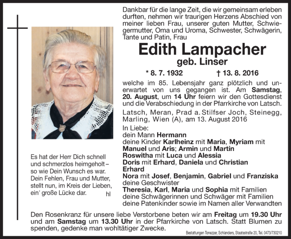 Latsch, Meran, Prad a.St.J., Steinegg, Marling, Wien (A), am 13. August 2016