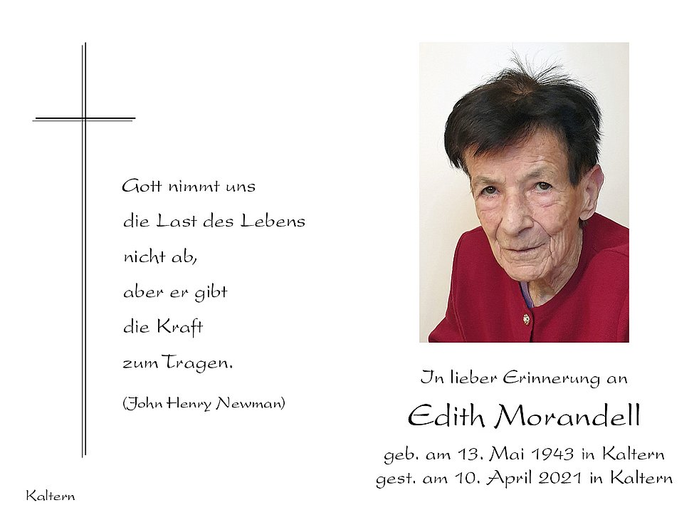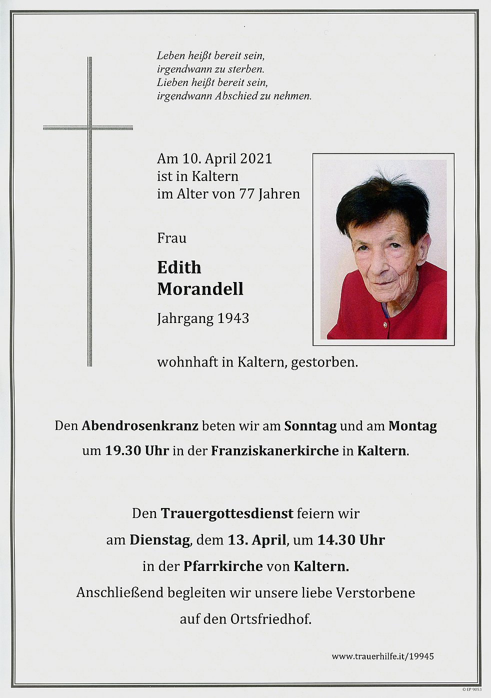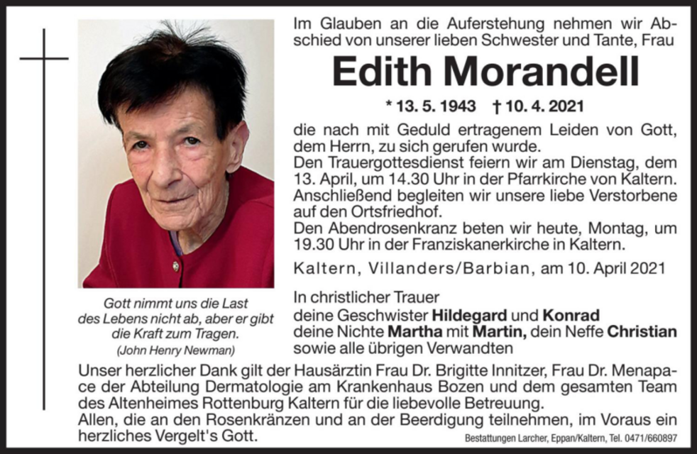 Den Trauergottesdienst feiern wir am Dienstag, dem 13. April um 14.30 Uhr in der Pfarrkirche von Kaltern. Anschließend begleiten wir unsere liebe Verstorbene auf den Ortsfriedhof.