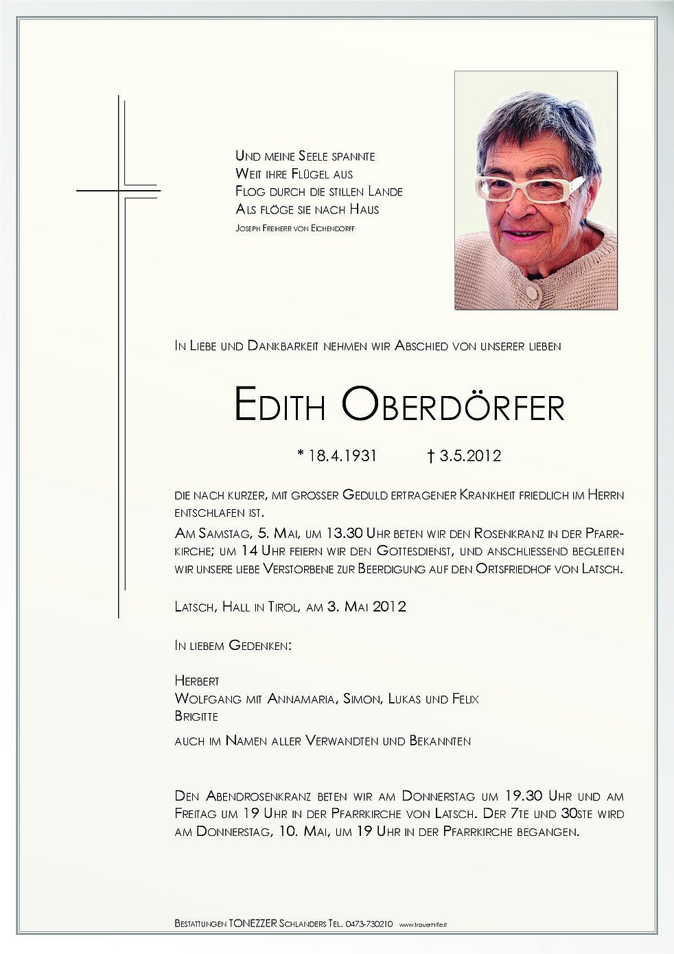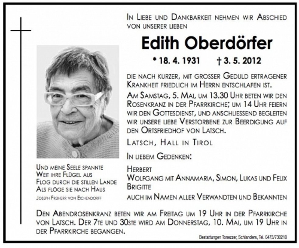 Am Samstag, 5. Mai, um 13.30 Uhr beten wir den Rosenkranz in der Pfarrkirche; um 14 Uhr feiern wir den Gottesdienst, und anschliessend begleiten wir unsere liebe Verstorbene zur Beerdigung auf den Ortsfriedhof von Latsch.