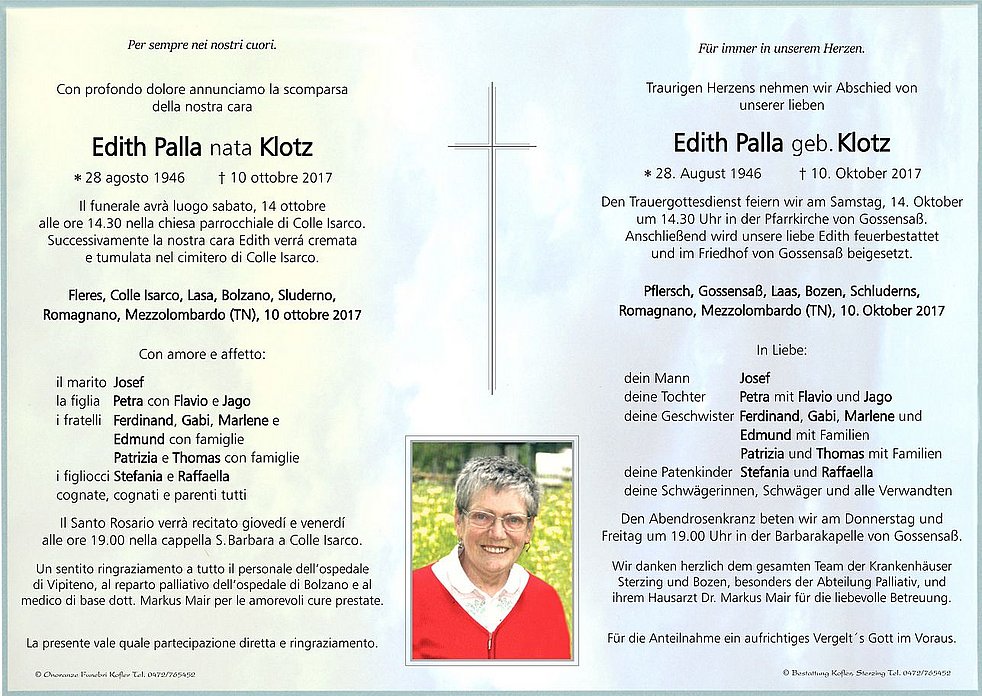 Il funerale avrà luogo sabato, 14 ottobre alle ore 14.30 nella chiesa parrocchiale di Colle Isarco. Successivamente la nostra cara Edith verrá cremata e tumulata nel cimitero di Colle Isarco.