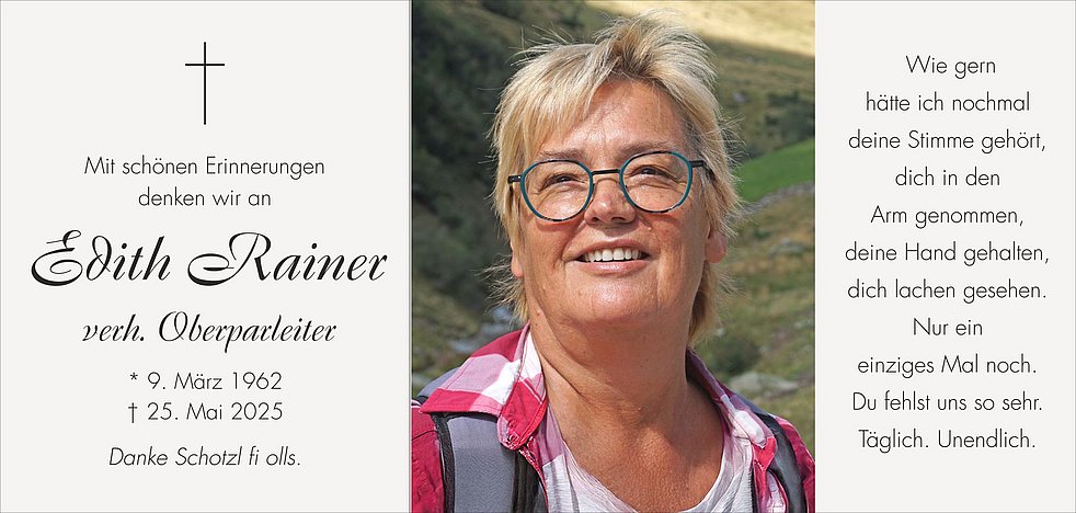 Unsere liebe Edith ist ab Dienstagnachmittag zur persönlichen Verabschiedung in der Friedhofskapelle aufgebahrt. Gemeinsam beten wir am Mittwoch um 19.30 Uhr und am Donnerstag um 14 Uhr in der Pfarrkirche. Die KVW-Ortsgruppe betet am Mittwoch um 15 Uhr.